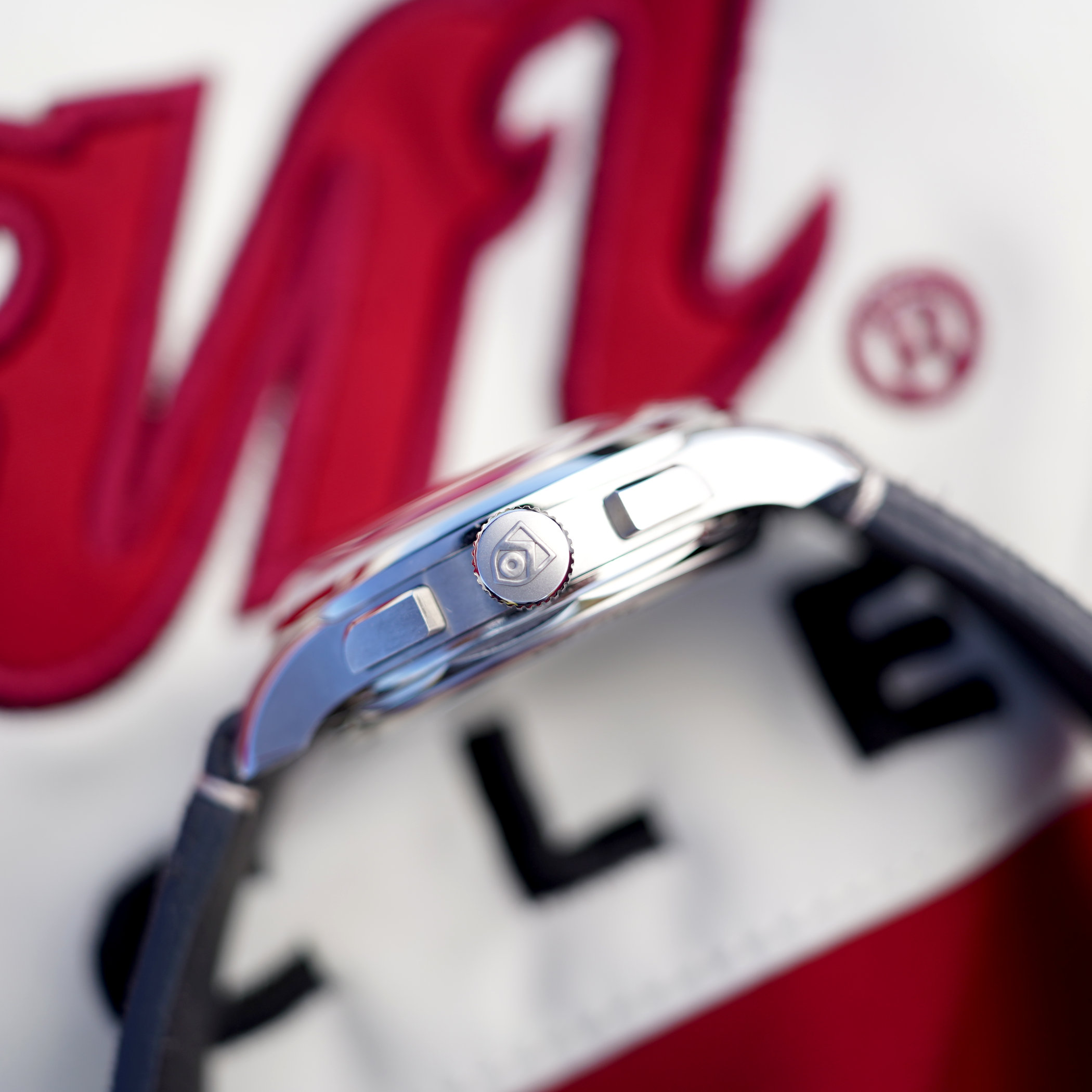 The Heritage Chronograph Indian Motorcycle edition gets a new dial design which takes inspiration from a mix of things. The layout hasn’t changed, but the colours obviously have. The cream base colour is paired with a deep red tone, both taken from the Indian Motorcycle’s famous headdress logo. This colour can be found on the tachymeter scale and minute track, in the subdials, on the central chronograph seconds hand and in the section at the bottom. In turn, this is shaped after the dashboards of Indian motorcycles and has the alternative script logo in cream. The remaining hands are finished in a dark grey tone to provide a good contrast against the cream and red background.