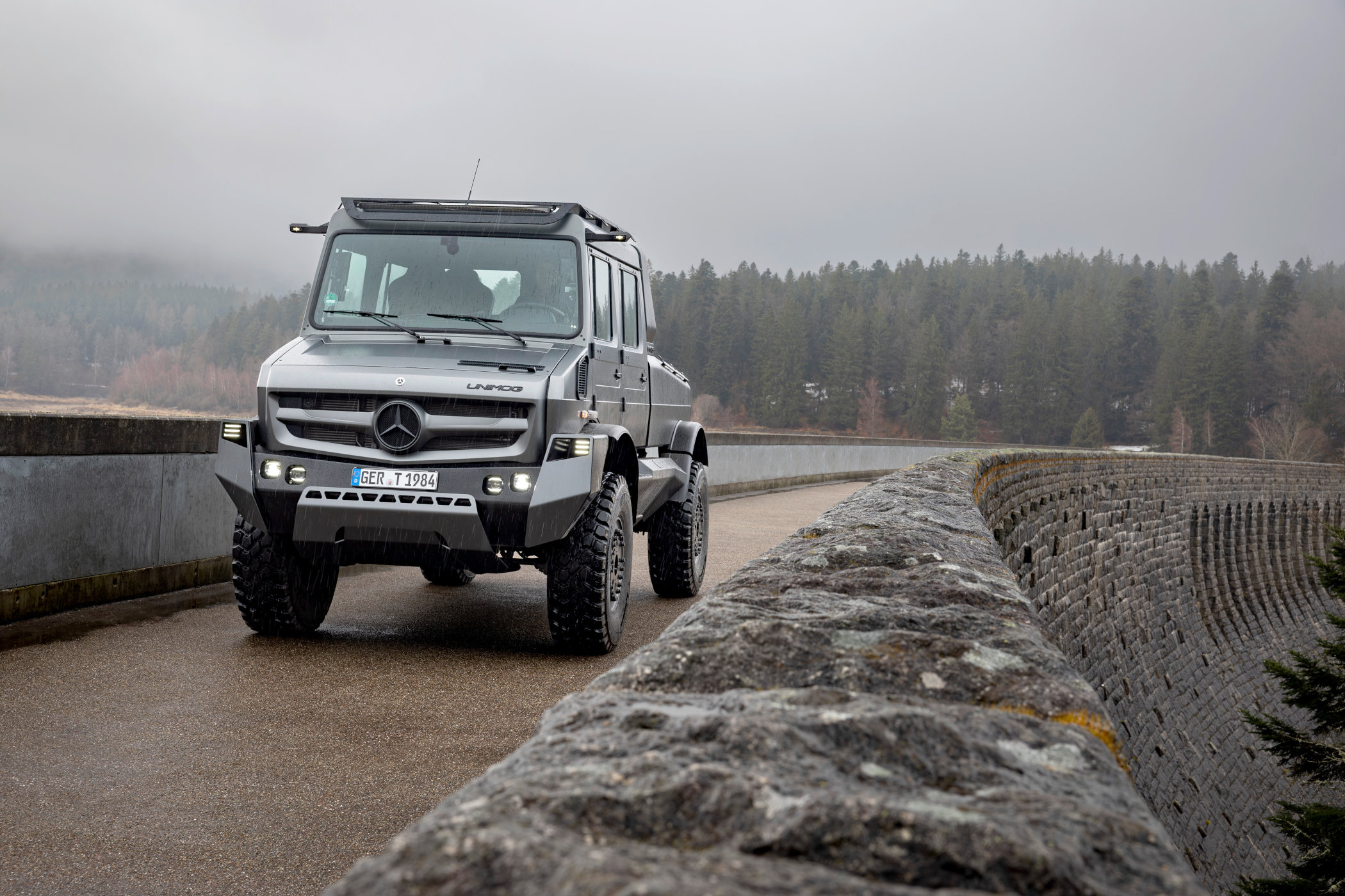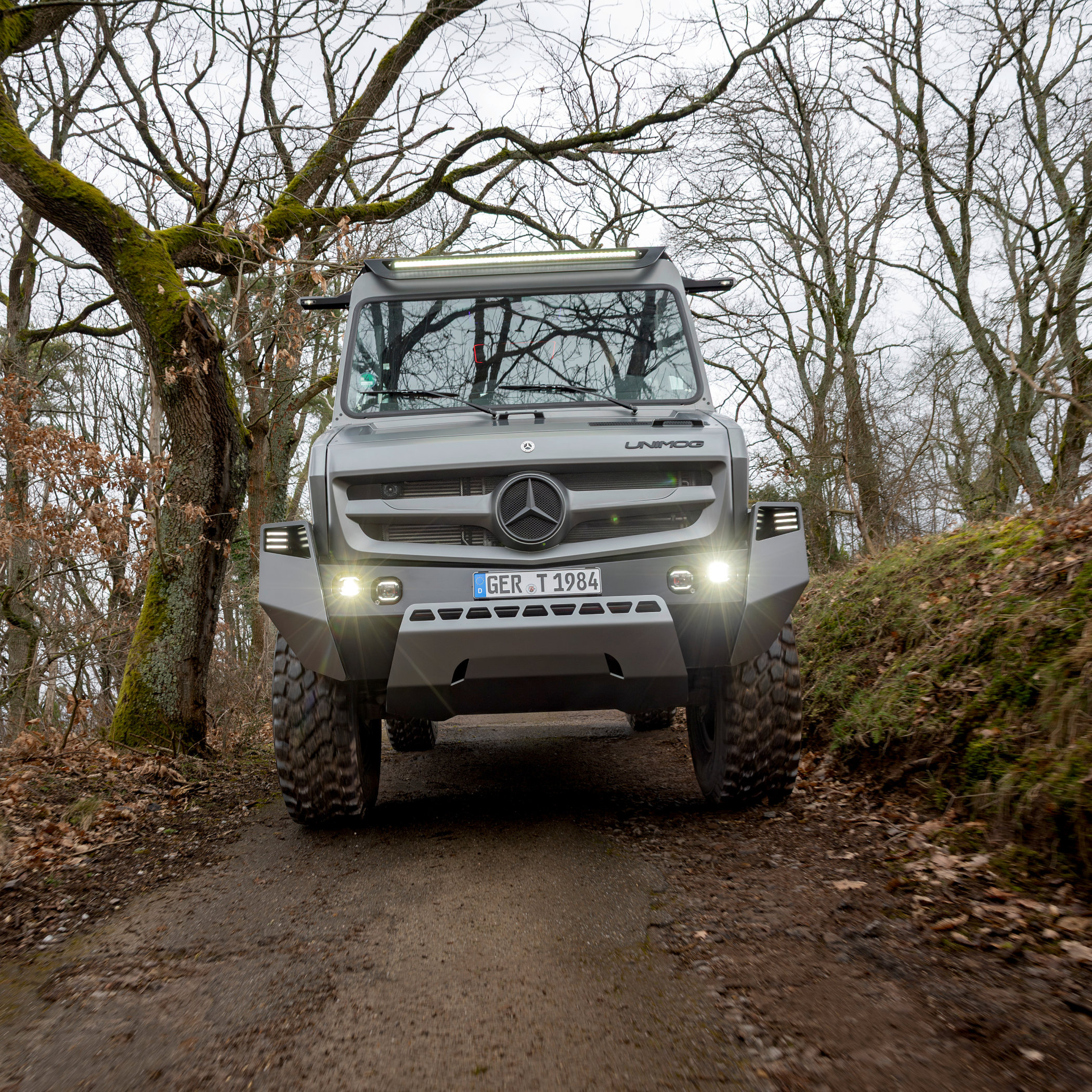 The four-door cab is clad in leather, with four individual sports seats to keep the Unimog’s crew (seems like a better way to put it) in comfort. It also features ambient LED lighting on the inside, as well as climate control, mobile connectivity and so on. The exterior is finished in matte grey, has a special LED lighting system to see miles ahead at night and scare the crap out of people on the road, and has a pick-up bed to haul all your adventuring necessities.