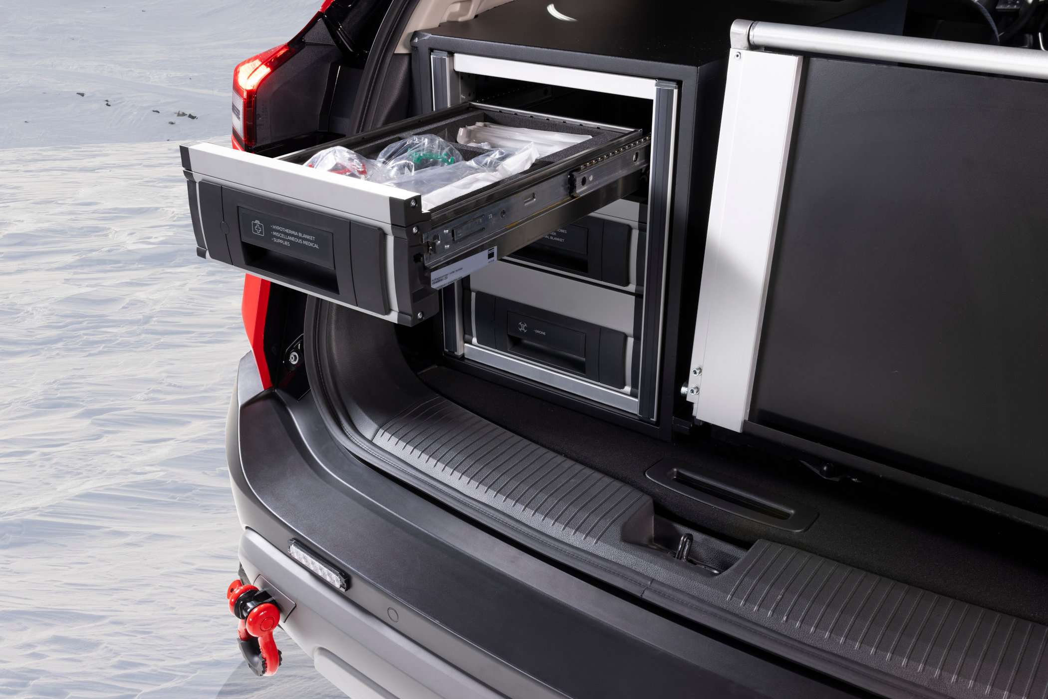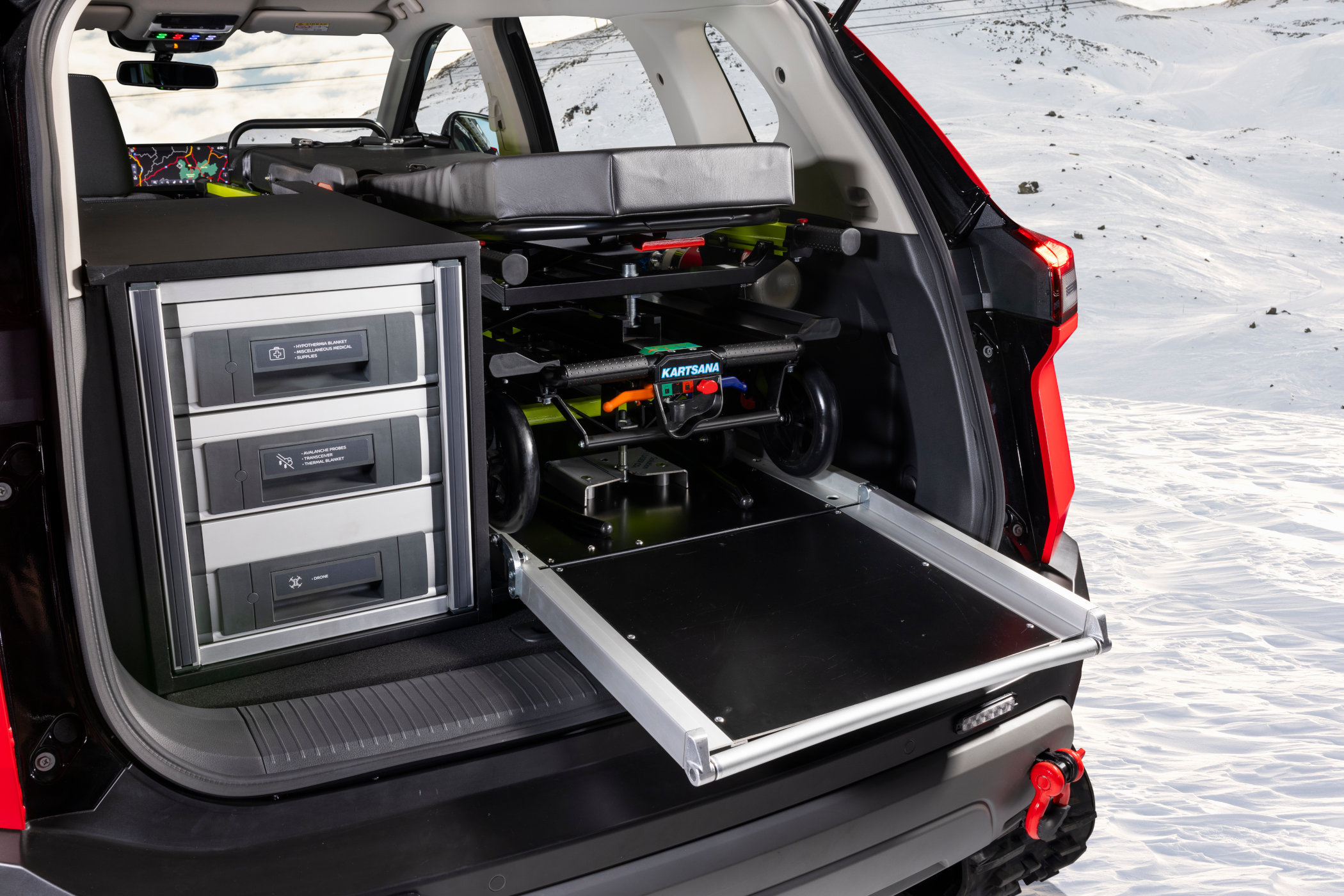 The modifications don’t end there as on the outside, there’s also a winch system installed in the front bumper, permanent tow hooks front and back, skid plate protection, footboard for easy access, a full emergency light system, wider fenders to accommodate the snow tracks, and a custom roof rack on top. This is fitted with a pair of skis an evacuation stretcher, and additional side lights to illuminate the surroundings of the car at night. lastly, it’s been given a bright red and grey paint job, with yellow emergency markers to it stand out like a sore thumb, which is exactly what you want in an emergency.