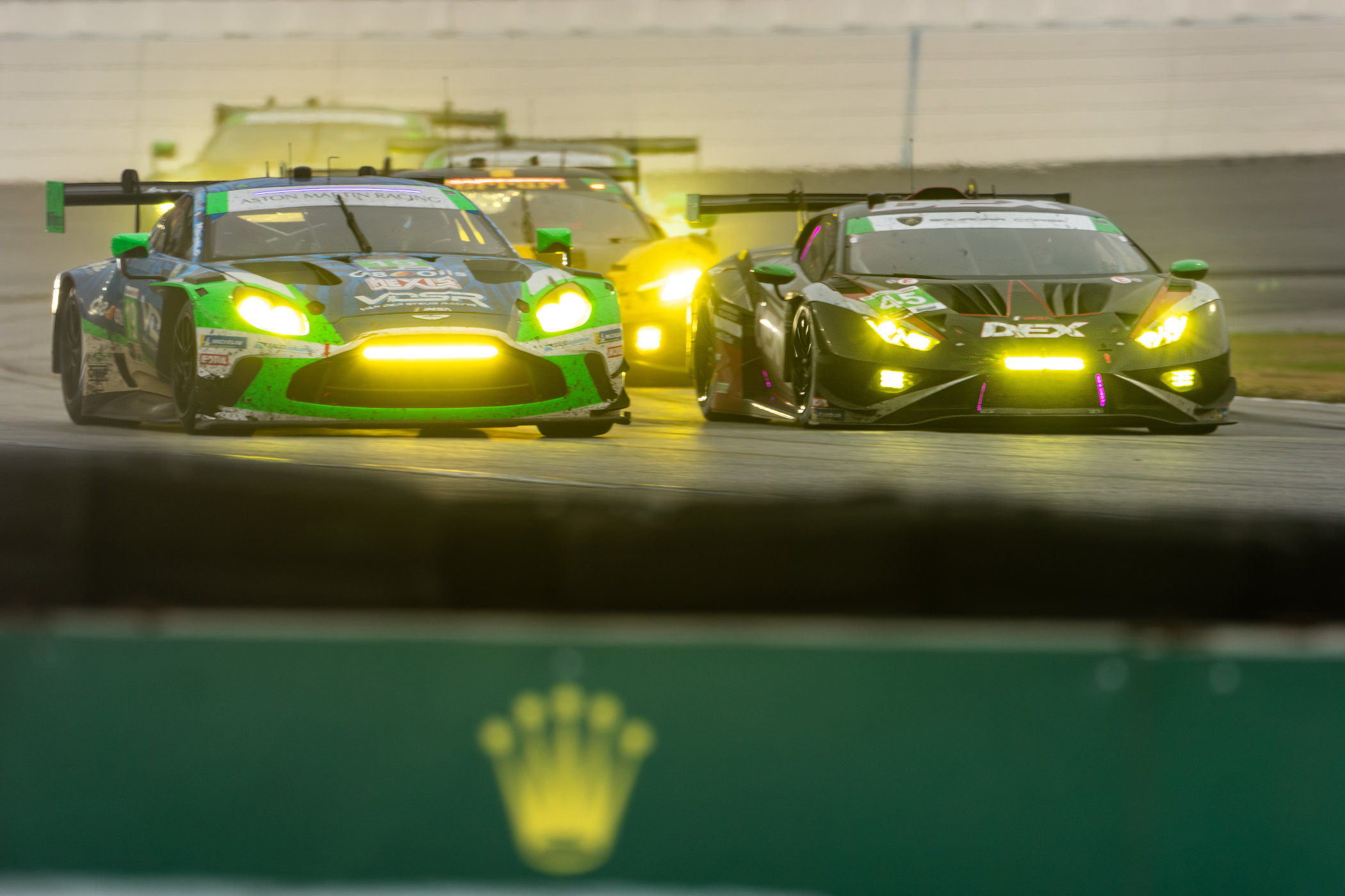 After about an hour of racing, the #52 Bryan Herta Autosport with PR1/Matthiasen car, driven by Ben Keating, was in the lead of the LMP2 class, but was overtaken by the #99 AO Racing car after the initial pit stops. Multiple incidents followed over the next couple of hours, with the #99 staying clear of drama and having a firm grasp on the lead as the race hit the halfway mark. With others suffering tyres coming off, collisions with competitors or spinning off on their own, the battle for the top spot continued between the #99 AO Racing car and the #22 United Autosports car.