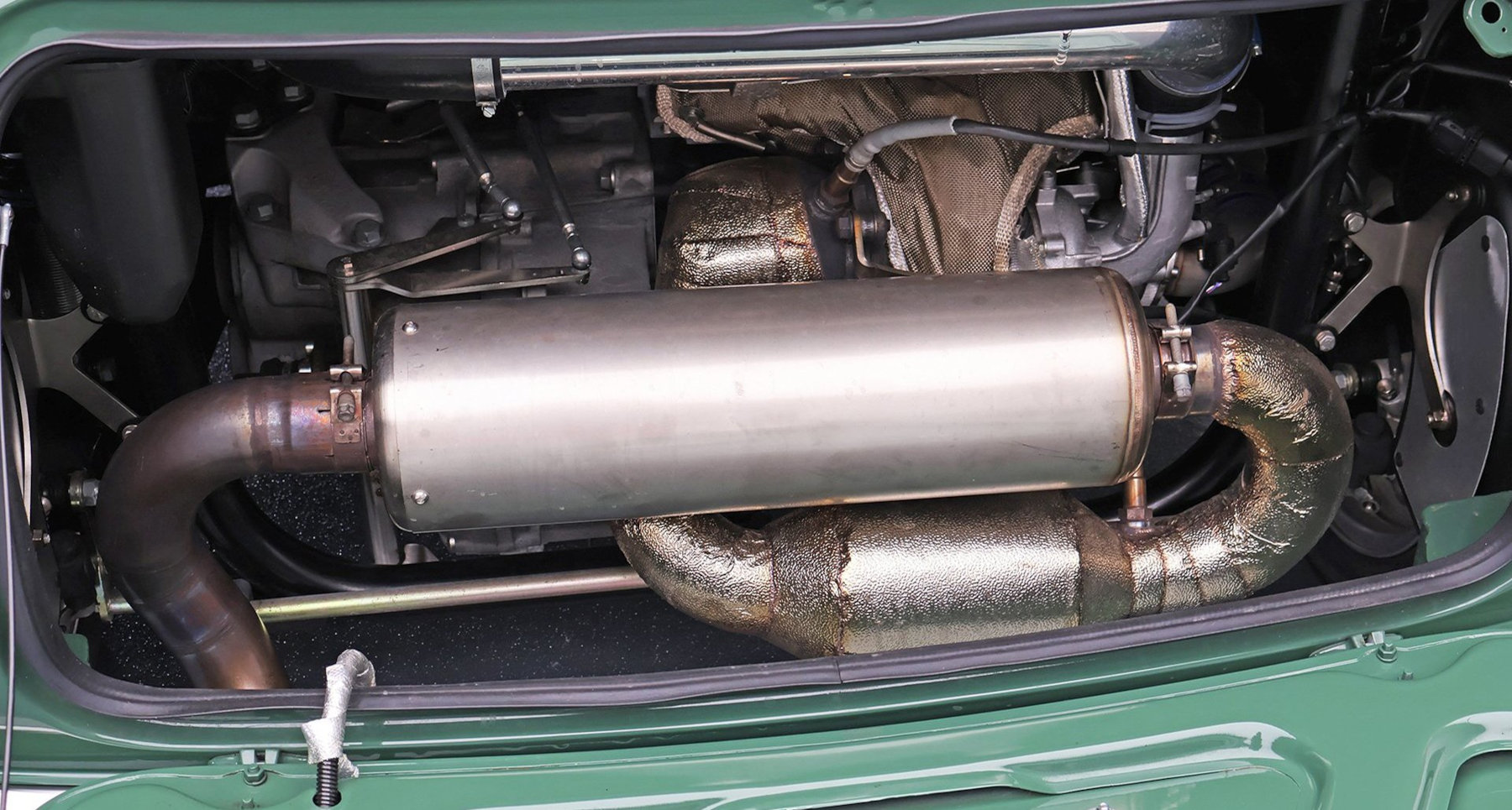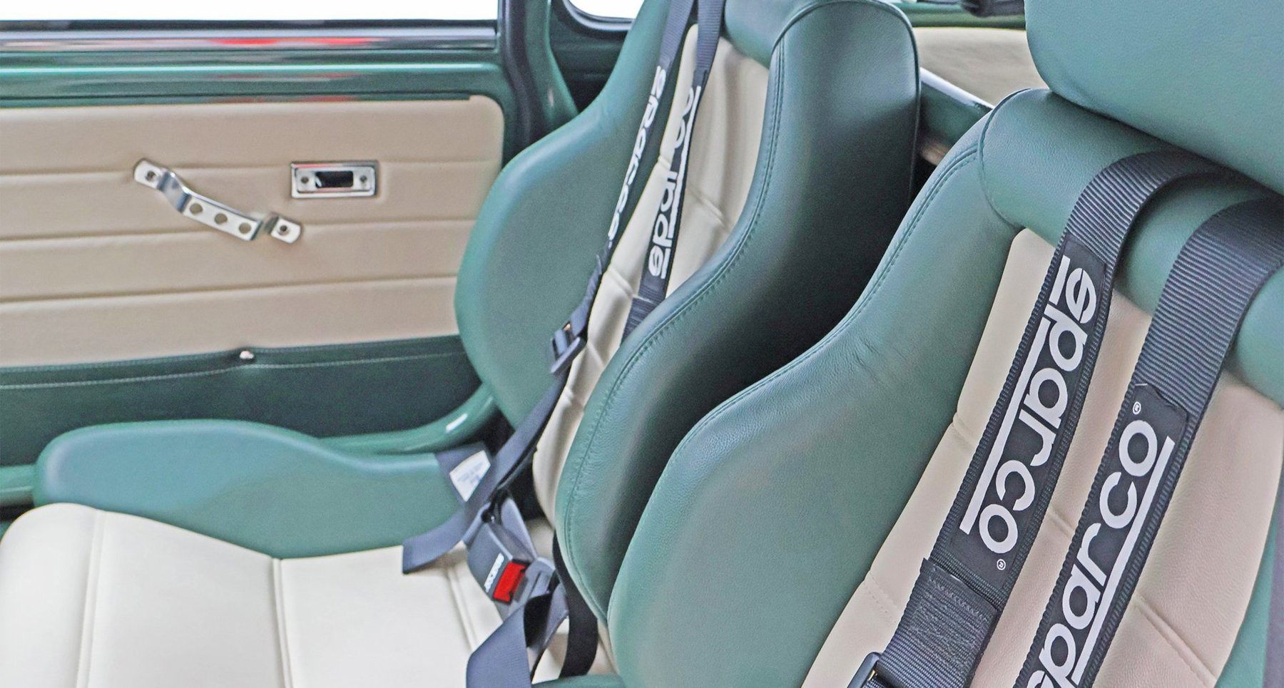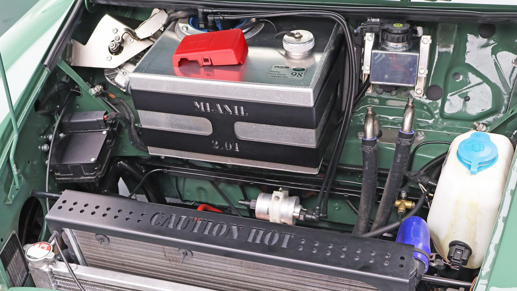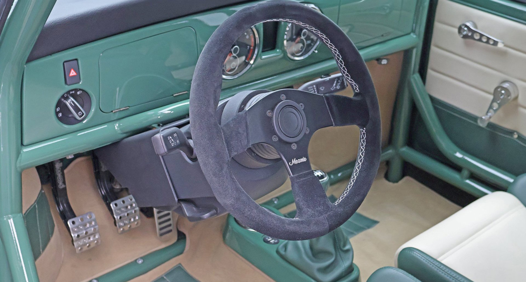 The outside, finished in a lovely tone of green, doesn’t reveal too much of the madness that’s happening on the inside. It sits on Mini Lite-style wheels, and it has a special badge, but other than that, it looks rather innocent. Open up the doors, though, and you’ll start noticing some interesting details, not in the least the aforementioned rear-mounted engine! There’s more, though, as a full tubular roll cage is installed, along with a four-point racing harness and a pair of leather-clad bucket seats. For the rest, the interior is quite minimalistic, as it should be in a classic Mini.