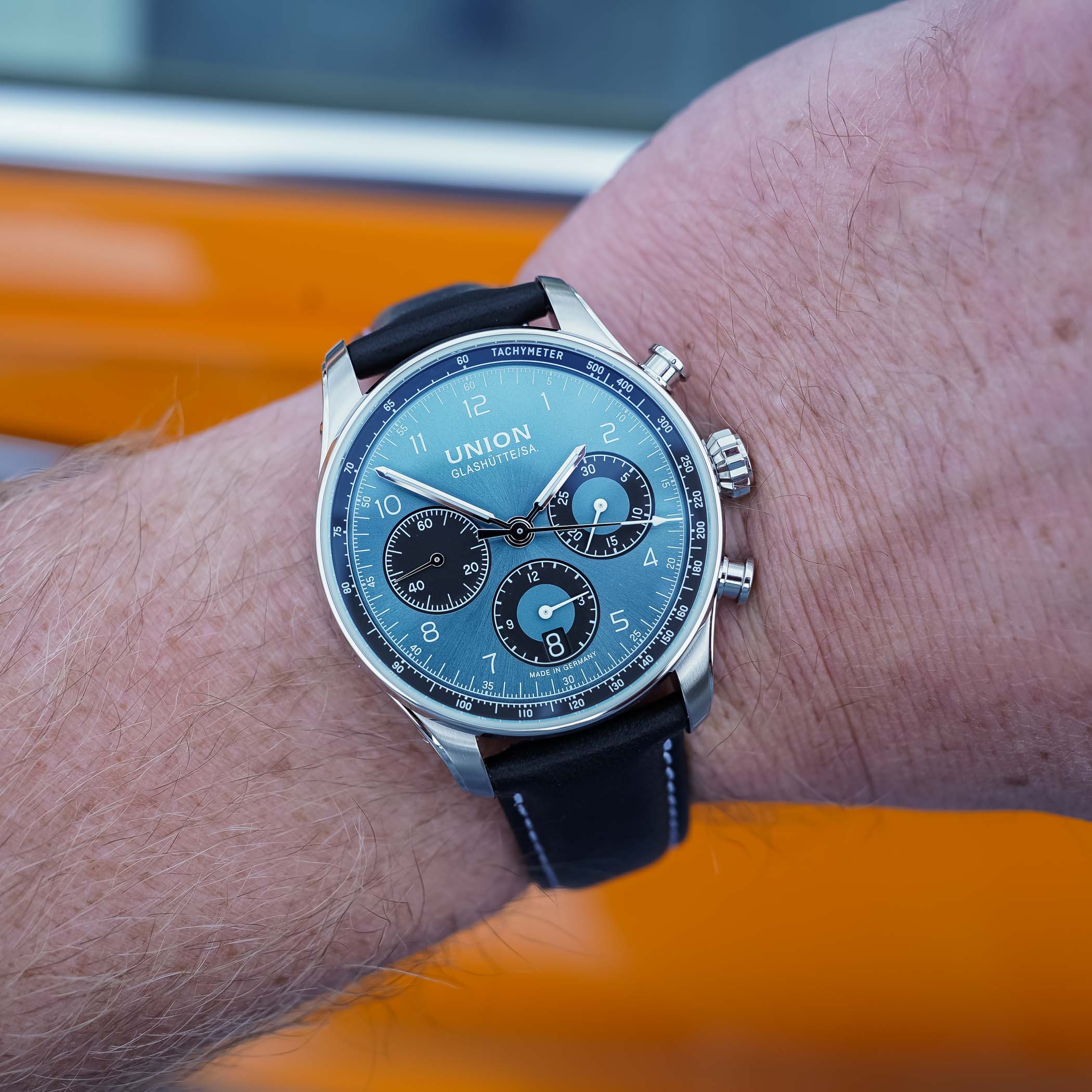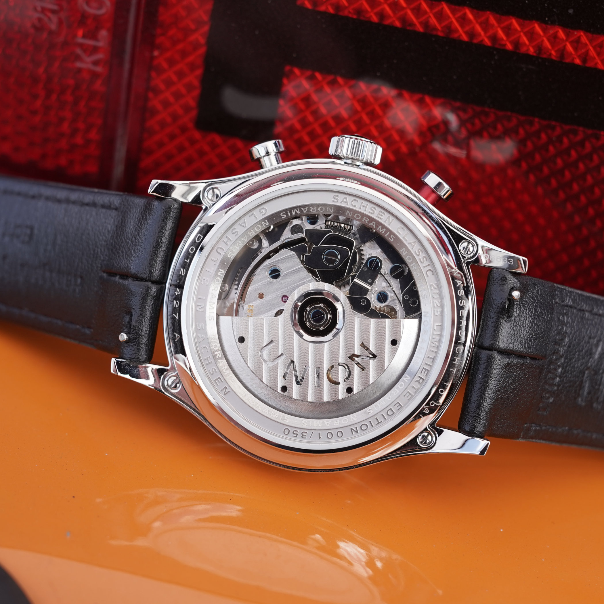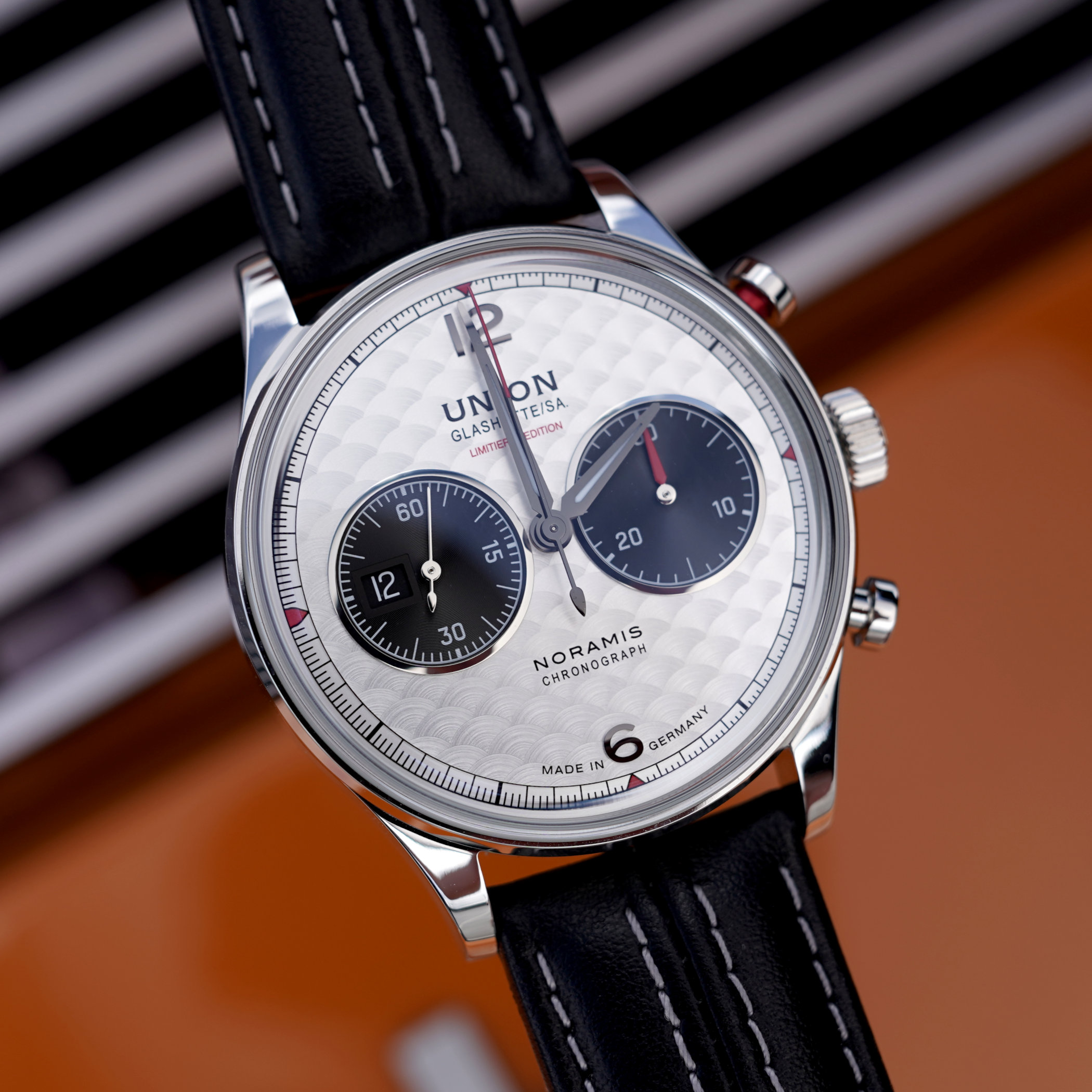 Anyway, both watches were a joy to wear but very different in appeal. The Noramis Chronograph Limited Edition Sachsen Classic 2025 was a pure motorsports-inspired chronograph watch with a very clean and legible two-register dial. The silver base is finished with a perlage-like swirling pattern that mimics the look of instrument panels in vintage cars. The two black chronograph subdials resemble dashboard instruments, there’s a touch of red on the hands, and the leather strap reminds you of a plush leather seat in a classic sports car. The robust Valjoux 7753-based UNG-27-S2 automatic chronograph movement runs like a dream and adds a nice heft to the watch.