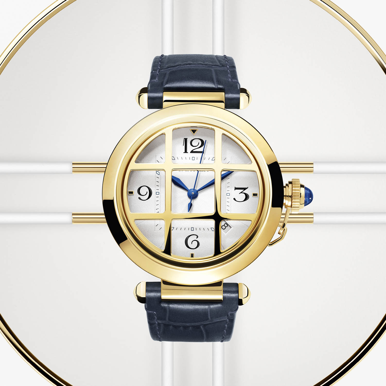 The latest 41mm Pasha de Cartier Grille is presented in a yellow gold case with a thickness of 9.5mm and water-resistance of 100 metres. The incorporation of the grid accentuates the dynamic design of the Pasha with its thick, mirror-polished bezel and square railway track in the centre of the dial. Crafted in hand-polished yellow gold, the removable grid over the dial adds even more personality to a watch that is per se on the exuberant side of things. Four small clasps with a tiny spring allow the grid to be easily attached and detached. With its protruding sapphire cabochon-tipped crown and chain, and the classic Vendome-style bars with rounded Clous de Paris tips designed and patented by Louis Cartier in 1934, the Pasha has a lively, extroverted personality.