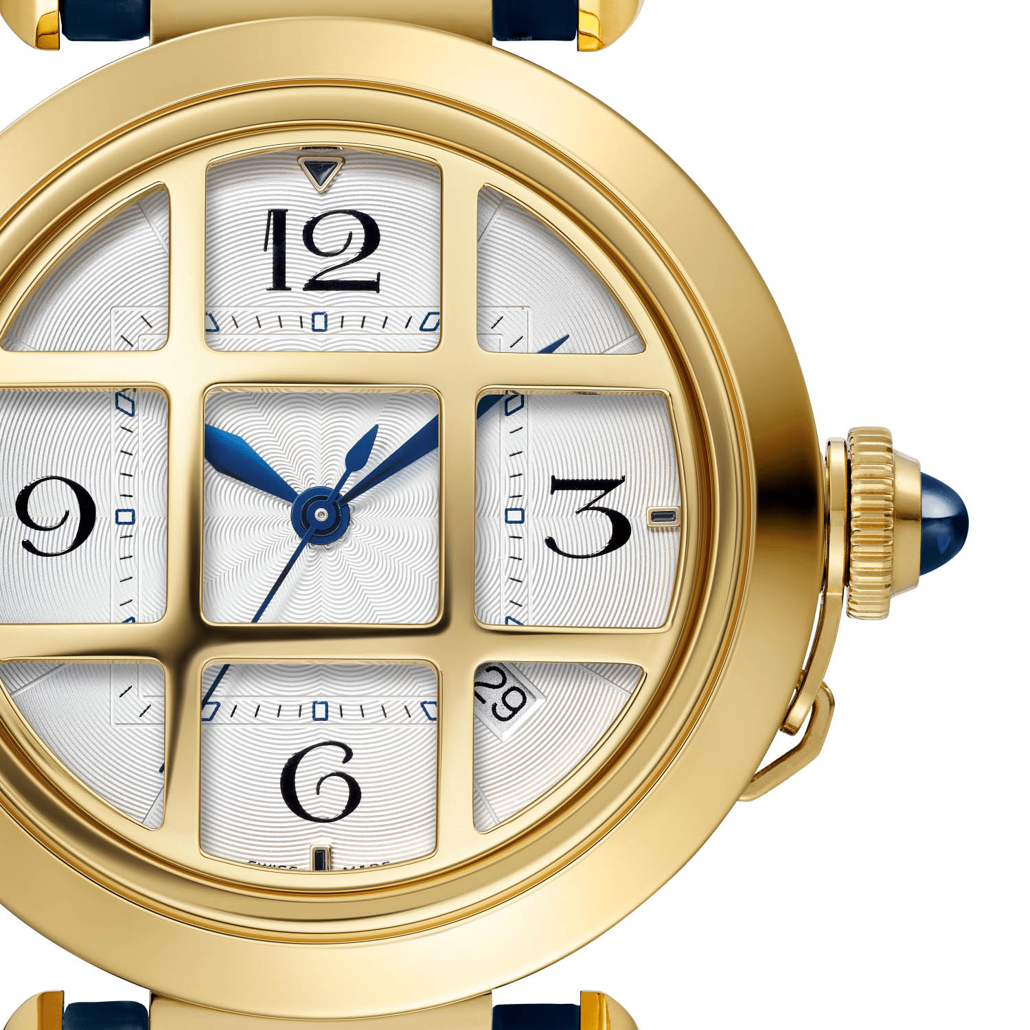 A practically invisible mechanism, known as Cartier’s QuickSwitch system, lets you change the strap in an instant. The small button on the reverse side of the bar lugs releases and attaches the bracelet or strap. In this case, the model is offered with blue or dark grey alligator leather straps.