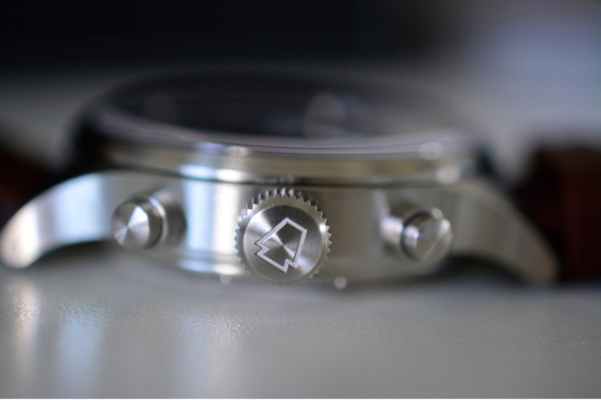 There’s an ongoing theme with several RGM watches (usually with the hands) involving a keystone, which is the central wedge of an arch that locks everything together. With the Model 600 Chronograph, it’s engraved on the crown. Why a keystone? A couple of reasons – Pennsylvania is known as the “Keystone State” and Roland was really taken by a set of hands he was given during watchmaking school in Lancaster, Pennsylvania. They were made by the Keystone Watch Company in the late 19th century with a Keystone outline on each hand and RGM has revived the design. The keystone hands on the PS-801-Skeleton are a good example. The 22mm strap is a rustic brown leather with white stitching and a signed pin buckle, and it’s well sized for those with smaller wrists (myself included).