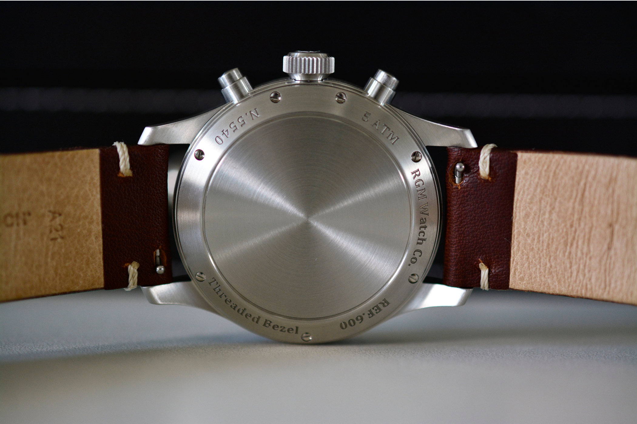 The Model 600 Chronograph case is 316L stainless steel with a diameter of 42mm and height of 12.4mm, or 14mm with crystal. That crystal is a raised, box-style sapphire and a first for RGM, providing retro distortions at sharp angles. It’s an important detail as the watch is a throwback to the 1960’s and 1970’s. The entire case has a satin bushed finish with a period correct solid case back, while the pushers at 2 and 4 o’clock have a simple military aesthetic. The crown doesn’t screw down, but there’s a doubled gasket that allows for a water resistance rating of 100 metres.