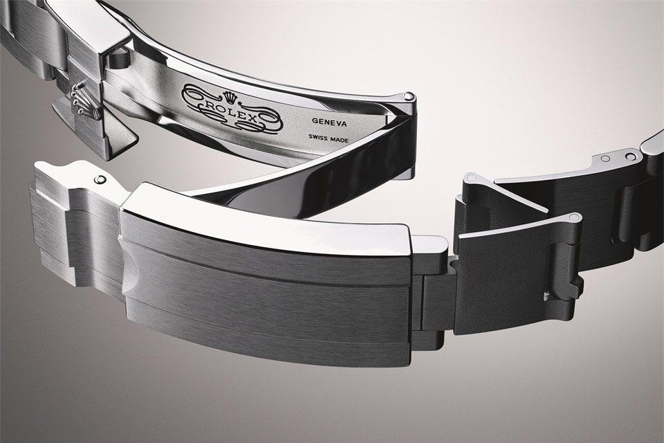 - Bracelet: Oyster three-piece bracelet with solid links, 904L stainless steel, satin finished, polished edges, Oysterlock folding safety clasp, Rolex Glidelock extension system (20 mm in increments of 2 mm), Fliplock extension link (26 mm)