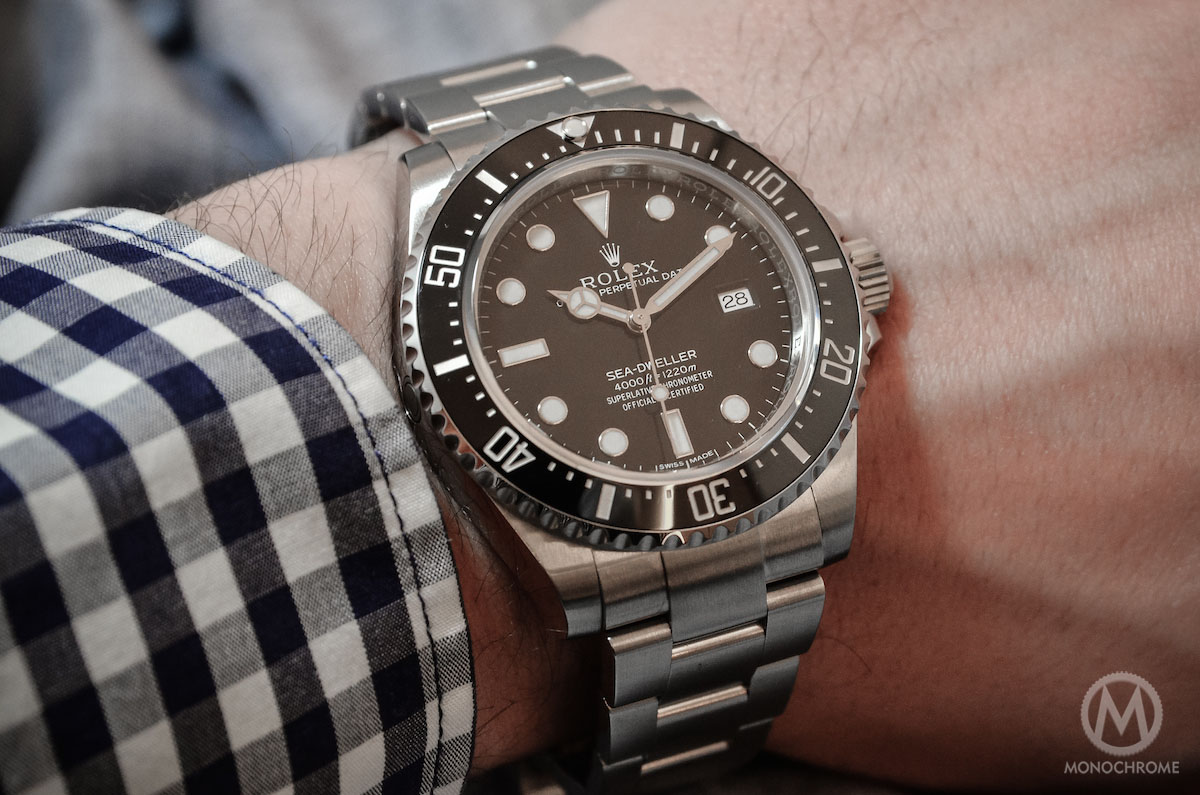 Honestly, we have missed the Sea-Dweller in the past 6 years. With the introduction of the Sea-Dweller Deep Sea in 2008 the SD ref. 16600 disappeared from the collection. That was one of the reasons to include it in the wish list that we published a few weeks before Baselworld. After 7 years of absence from Rolex’ collection, the Sea-Dweller is back in a contemporary version featuring a Cerachrom bezel insert, the Oysterlock safety clasp and Rolex Glidelock bracelet extension system.