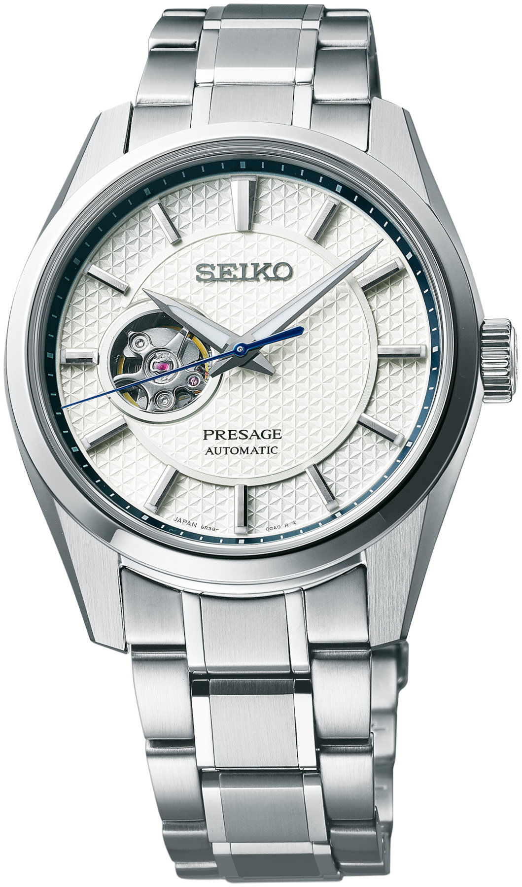 Quick Facts – 40.2mm x 11.8mm – stainless steel case with super-hard coating, brushed and polished – sapphire crystal on both sides – 100m water-resistance – Shironeri white or Aisumi blue open-heart dials with Asahona hemp-leaf pattern – faceted, brushed and polished hands and indices – LumiBrite on hands and markers – Seiko 6R38, in-house – automatic winding – 21,600vph – 24 jewels – 70h power reserve – central hours, minutes, seconds – stainless steel bracelet or brown leather strap – EUR 1,000
