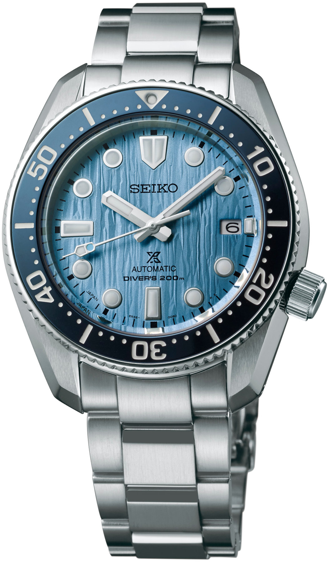 Quick Facts – 42mm x 12.5mm – stainless steel case with super-hard coating, brushed and polished – unidirectional rotating bezel with glossy blue insert and 60min diving scale – sapphire crystal – solid caseback – screw-down crown – 200m water-resistant – medium ice-blue textured dial – applied indices with LumiBrite – large faceted and polished hands with LumiBrite – Seiko Calibre 6R35, automatic – 21,600vph – 24 jewels – 70h power reserve – hours, minutes, seconds, date – stainless steel bracelet – EUR 1,300