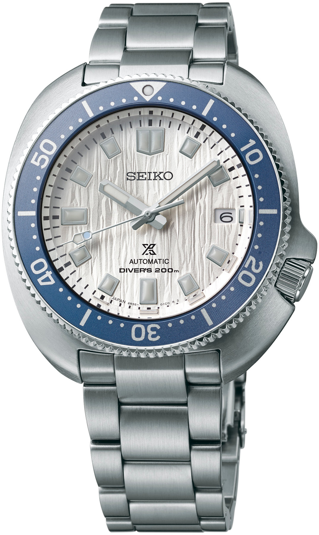 The last of the three new Save the Ocean divers is the SPB311, which takes inspiration from the 1970 reference 6105, worn by Naomi Uemura on his 12,500km solo dog sled run from Greenland to Alaska. This style is affectionately known as the “Captain Willard” however, made famous by the movie Apocalypse Now. It has a 42.7mm wide and 13.2mm steel case, with an integrated crown protector. The bezel has a pale blue insert with a slight grooved texture and a 60-minute scale in white. Featuring the same texture for the dial as the other two, this time it’s given an ice white colour. Indices and hands are once more finished with LumiBrite inserts. Power comes from, you’ve guessed it, the 6R35 calibre. This too is worn on a steel bracelet and retails for a slightly higher price of EUR 1,400.