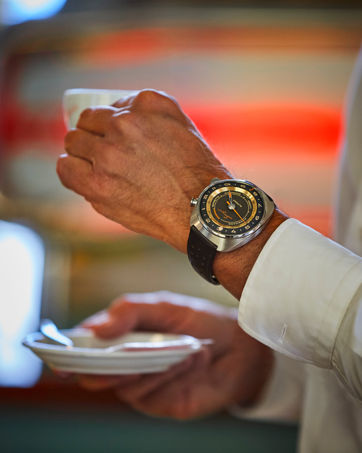 The coffee-timing magic happens on the dial, which has a matte black, velvety tone. The outer rotating disc is used to indicate the hours, with a pointer at the bottom of the dial. The brushed gold rehaut helps to read the minutes and chronograph seconds. Minutes are indicated via the large, orange-filled central hand. The needle-like central seconds hand is for the chronograph indication and thus used for timing the duration of your coffee being made. The orange section on the scale refers to the first few seconds, when hot water is infusing the ground coffee. Then the one-minute scale helps you time the making of a Ristretto, Espresso, Lungo or Americano. Pretty clever, and admittedly a bit of fun.