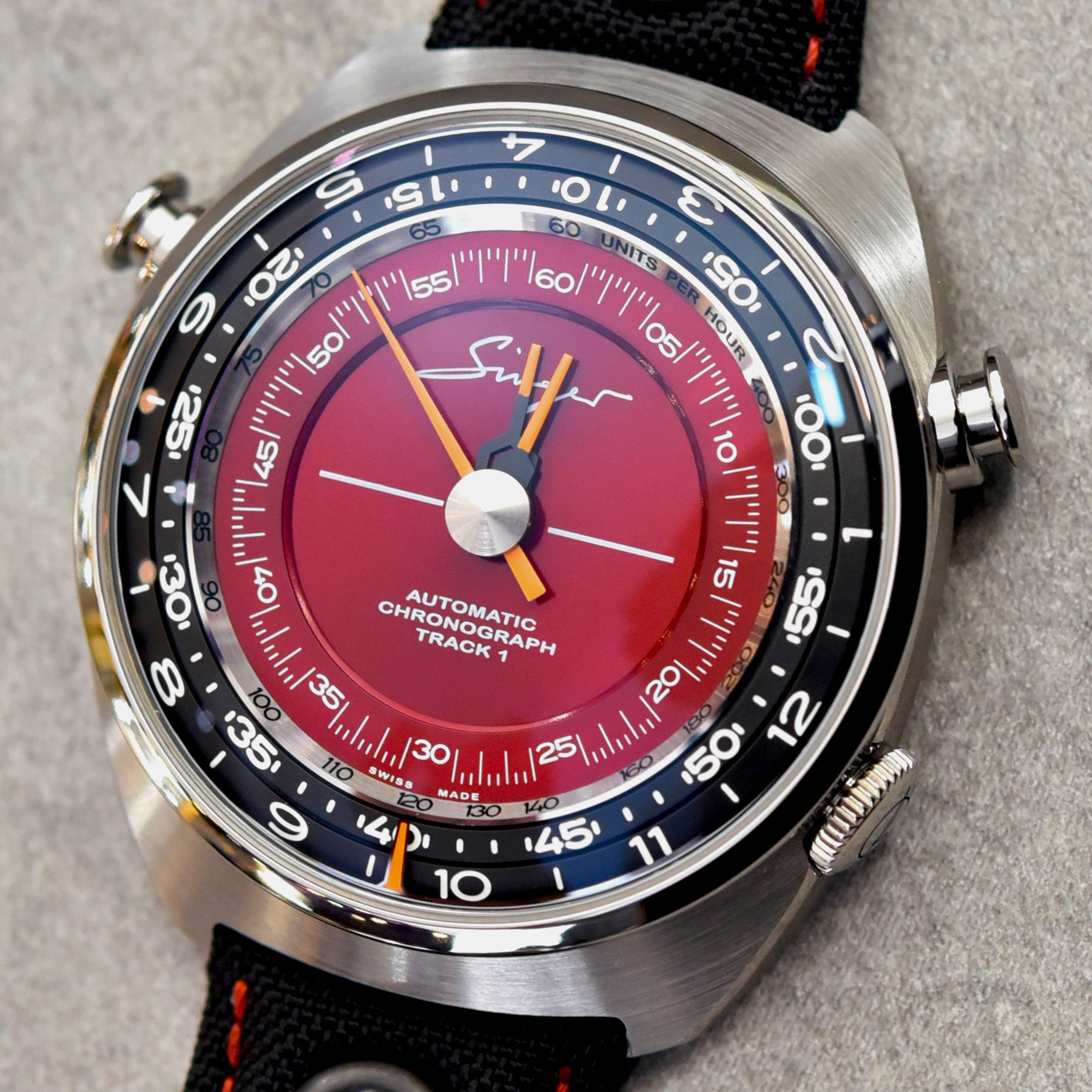Sticking to Dickinson’s philosophy of ‘reimagining’ mechanical objects, be they classic Porsche 911s or chronographs, the Track1 dispenses with the traditional sub-dial and central seconds hand of most chronographs and places the indications smack in the centre of the dial. The three co-axial orange hands in the centre of the dial correspond to the elapsed seconds, minutes and hours of the chronograph (upping the complexity, the hour and minute hands are jumping hands).