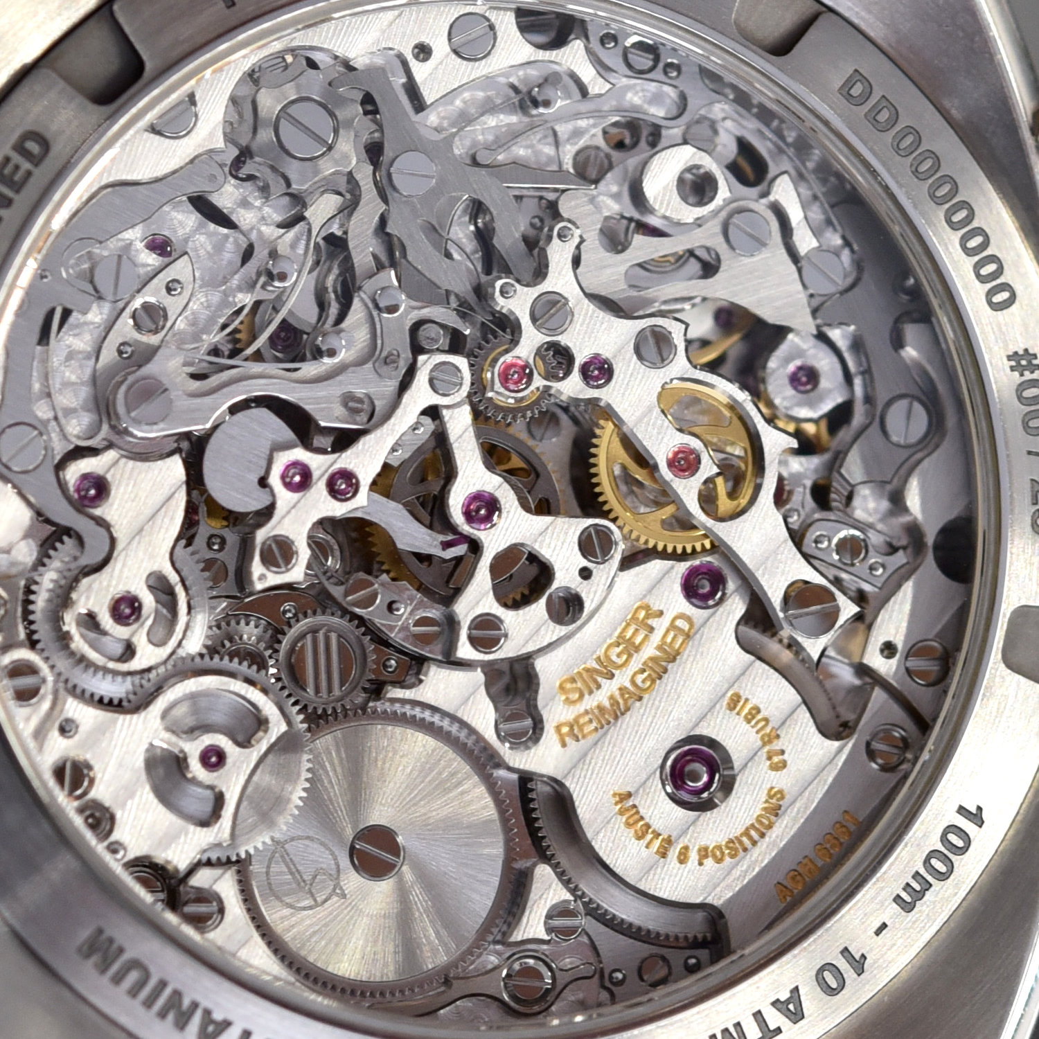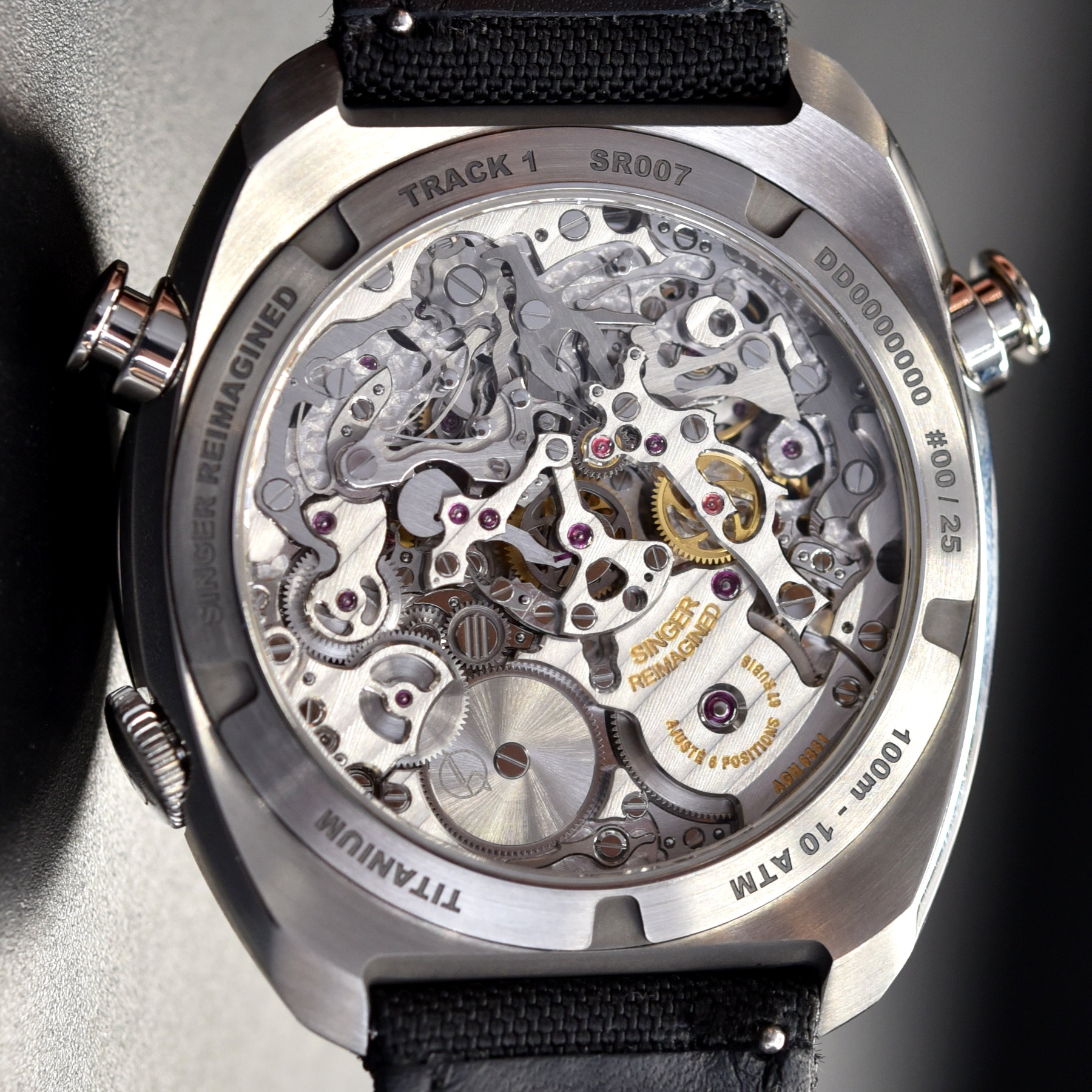 Under the bonnet is the impressive movement found on other editions of the Singer Track1: the calibre Singer 6361 or AgenGraphe. Developed by Jean-Marc Wiederrecht over a period of ten years, this groundbreaking movement reimagines the architecture of classic chronographs to display the chronograph functions in the centre of the dial. A veritable mechanical feast, the chronograph mechanism is connected to the timekeeping gear train with an innovative clutch mechanism. The coupling is horizontal, requiring less space, yet uses friction, just like a vertical clutch. A full description of the movement, the clutch and the jumping indications can be found in this article. This movement is automatic (the rotor is placed dial-side), and its specifications are a 3Hz frequency and a 60-hour power reserve. Visible through the sapphire caseback, the 477-part AgenGraphe movement is meticulously hand-finished.