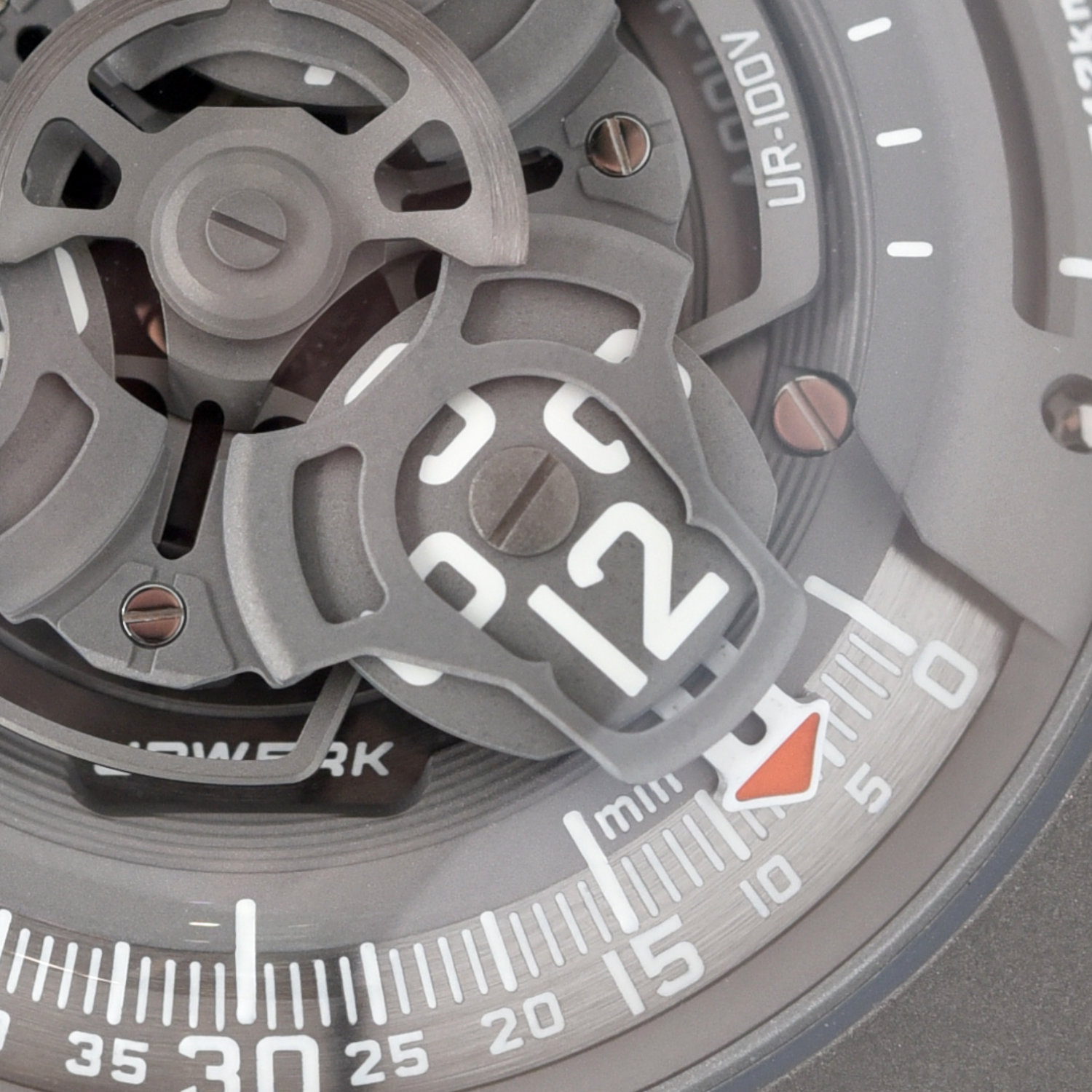 Having appeared in titanium and steel cases, followed by gunmetal, gold, iron and a wild version in textured bronze to replicate the scales of T-Rex, the UR-100V returns in a titanium case with a new articulated bracelet. The subtle shades of grey contrast to the clean white inscriptions animated by a touch of red on the arrow-shaped minutes hand and the 60-minute marker on the retrograde minutes track.