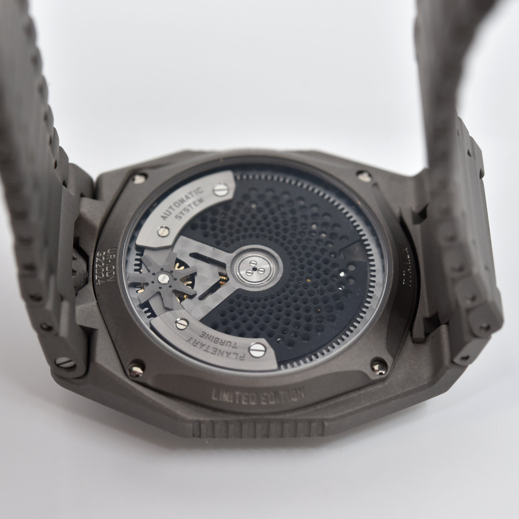 The back of the watch reveals the new calibre 12.02. Redesigning the carrousel to bring the hours closer to the minutes as they travel along the 60-minute scale was one of the upgrades made to the original calibre 12.01, making it easier and more intuitive to read the time. The full rotor you can see on the reverse side is drilled and governed by a profiled airscrew known as the Windfänger, a device used to minimise shocks and reduce wear and tear. The carrousel and triple baseplates are elaborated in ARCAP, an alloy that does not contain iron and is not magnetic. The automatic movement has a frequency of 28,800vph and a power reserve of 48 hours.