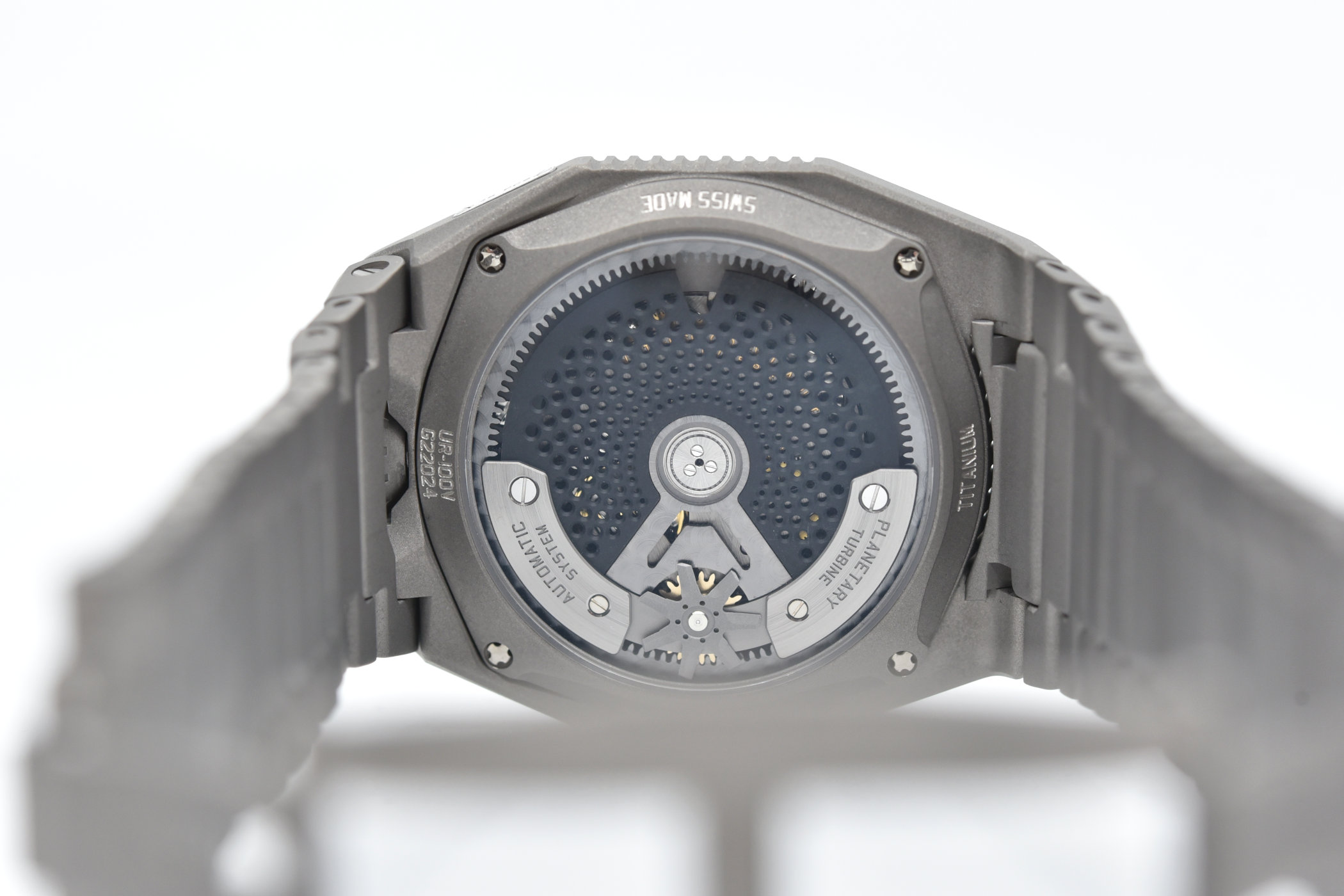 Although the look and feel of the watch is avant-garde, the finishings are incredibly detailed. The carousel and the structure on top of the hours are forged from anodised aluminium then sanded and shot-blasted, while the satellite screws are circular sanded and the screw heads chamfered. In the dark, the UR-100V lights up with blue Super-LumiNova glowing hours and minutes and white glowing astronomical indicators.