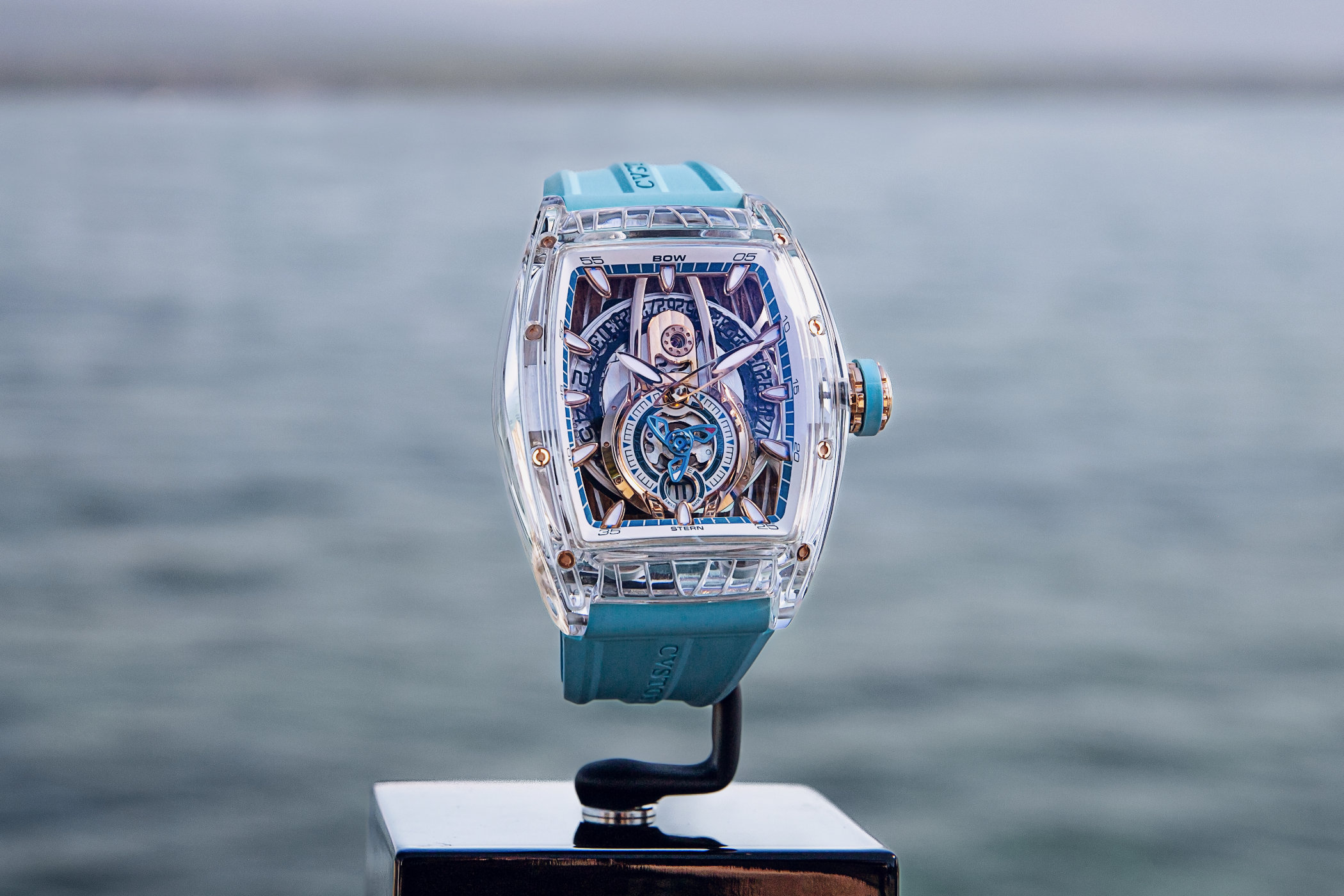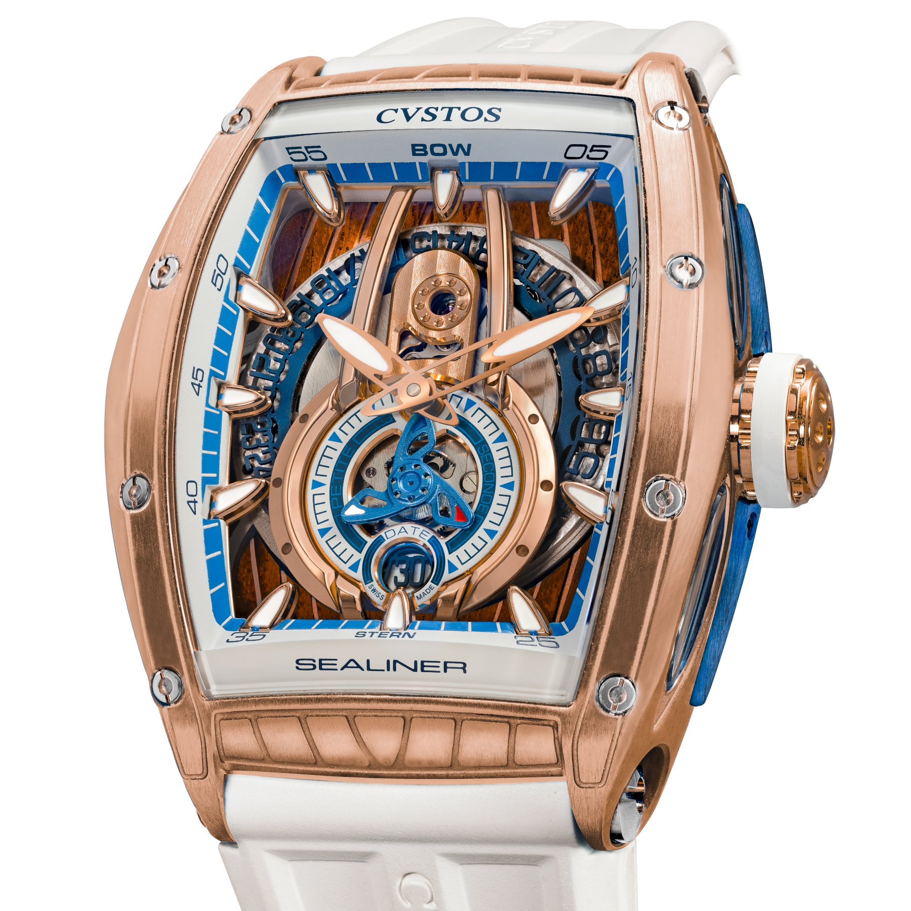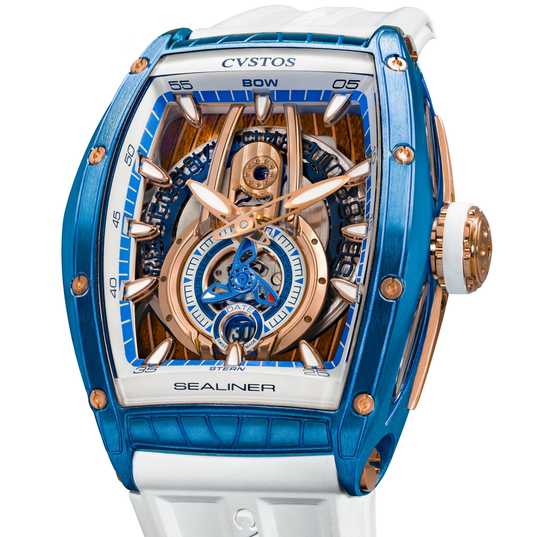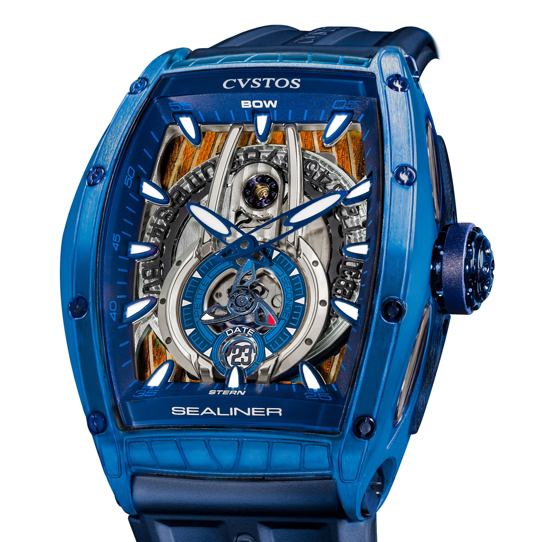 The case for the Cvstos Sealiner PS comes in various materials and sizes. It is available in steel, navy blue-coated steel, sky blue-coated steel, blackened steel and even gold. And to top it all off, two-tone variations or diamond-set cases are also an option. The tonneau-shaped case measures 41mm in width x 53.70mm in length or 45mm in width x 59mm in length. Each one is decorated with nautical-inspired engravings and features eight functional screws on the bezel, a double-curved sapphire crystal and a screw-down crown. The final and most extravagant version has a full sapphire crystal case, much like the brand did with the Metropolitan PS.