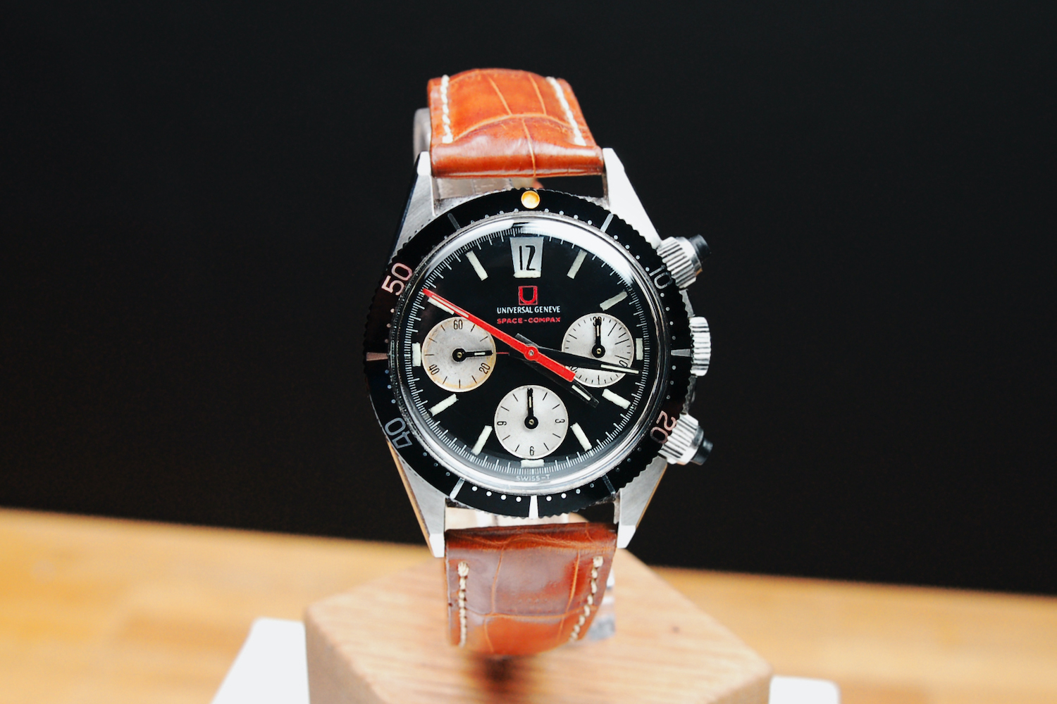 The Universal Genève Space Compax is a beautiful watch but not quite as robust as the Speedmaster – something I found out when restoring these watches back to their former glory. It is more a watch to step off your Riva motorboat at the quayside of the Monaco Yacht Club, just like the 1960s jet set. The watch was supposed to be suitable for both diving and motorsport, as both disciplines could utilize the 12-hour chronograph, as well as the bidirectional bezel for off-set timing.