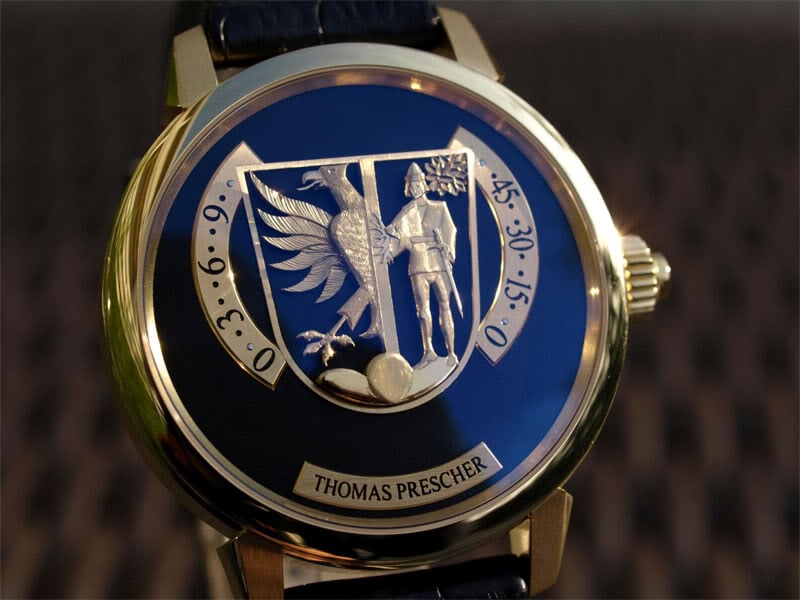 Independent Haute Horlogerie offers unique opportunities of customizing. Like this one… Thomas Prescher was asked to incorporate a family crest in the dial and hands of a watch.