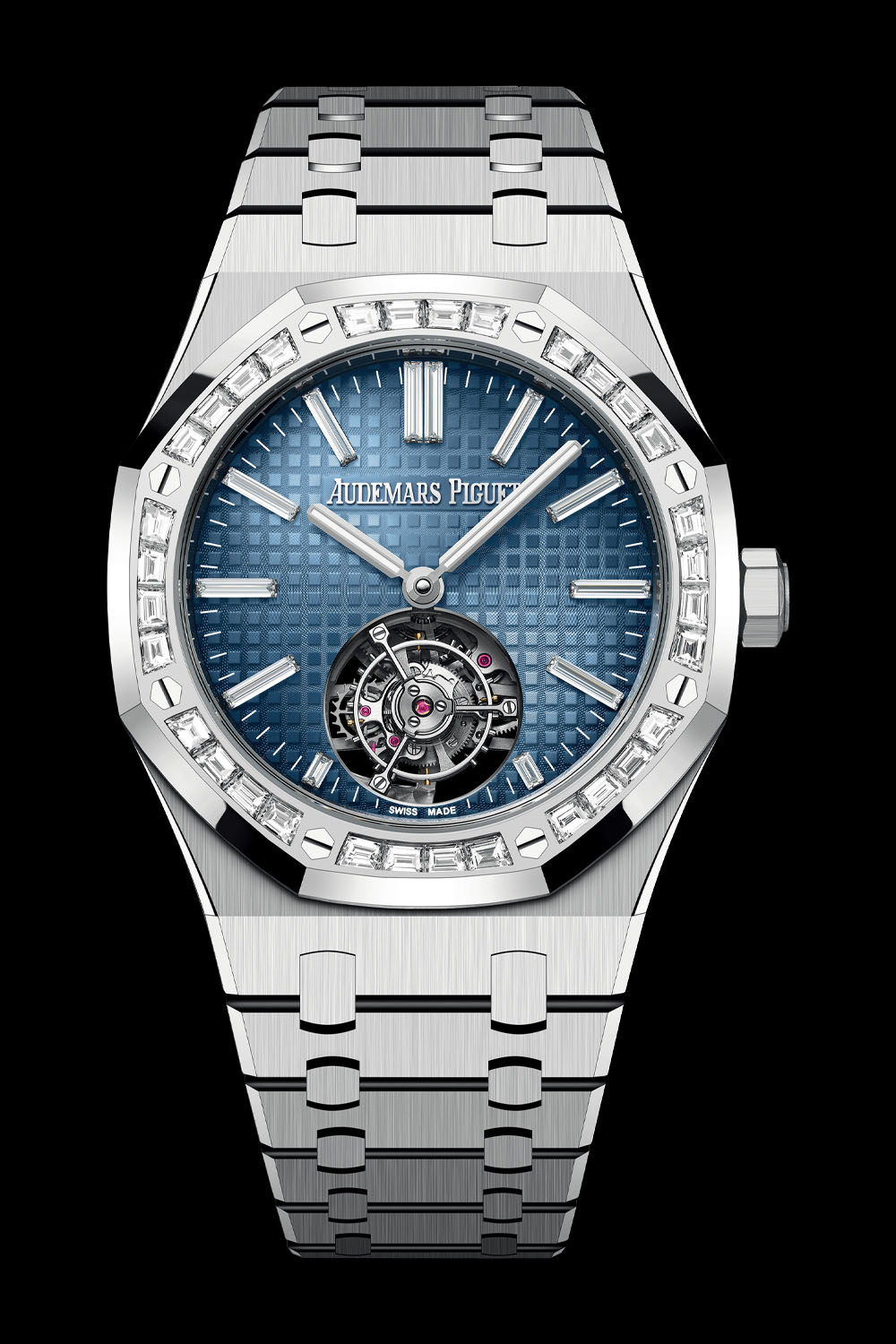 The third model for the Japanese market showcases watchmaking and gem-setting finesse with a flying tourbillon at 6 o’clock and a host of baguette-cut diamonds set on the bezel and as hour markers on the dial. Like the other two special editions, the Grand Tapisserie dial has a smoked light blue colour, and the Royal Oak hands are treated with luminescent material.