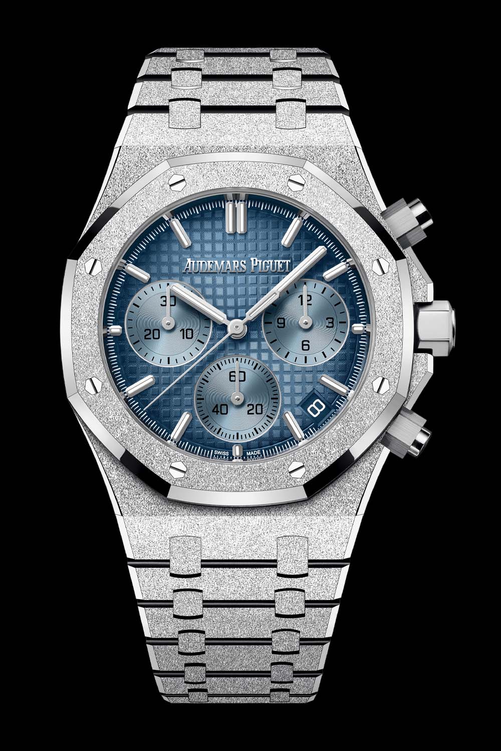The 50th anniversary of the Royal Oak also involved a subtle facelift for 34, 37, 38 and 41mm Selfwinding and Selfwinding Chronograph models. The iconic tonneau-shaped case, octagonal bezel with eight hexagonal screws, integrated bracelet and Tapisserie pattern on the dial were all respected. What it did involve, however, was a more sophisticated finishing on the case with enlarged polished bevels to enhance the play of light. Other tweaks include the tapering profile of the bracelet, thinner, lighter links, harmonised hour markers and hands across all the self-winding models, and tone-on-tone date wheels. The traditional AP monogram at 12 is replaced with the signature of the brand that is obtained using a galvanic growth process superimposing layers of gold before being applied to the dial.