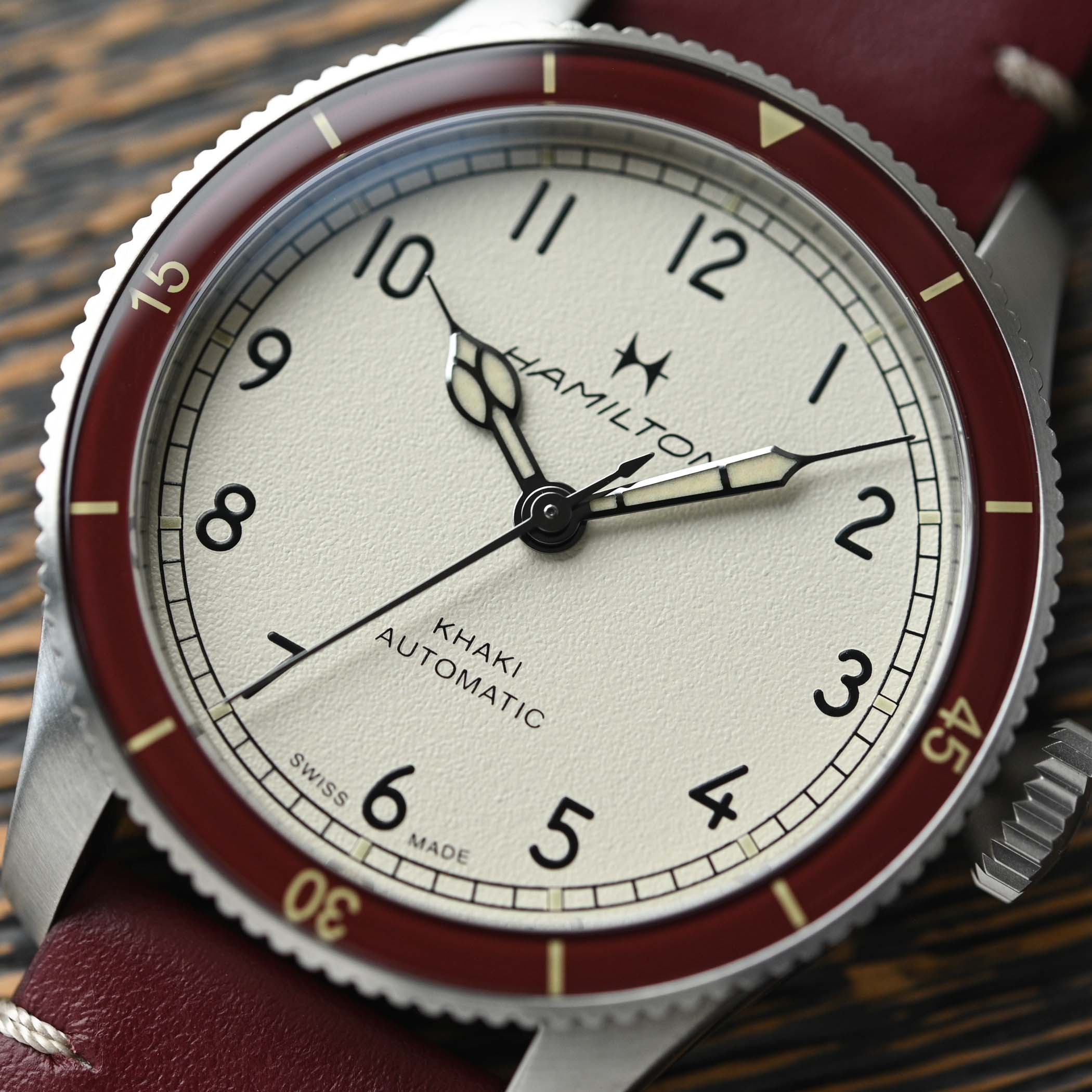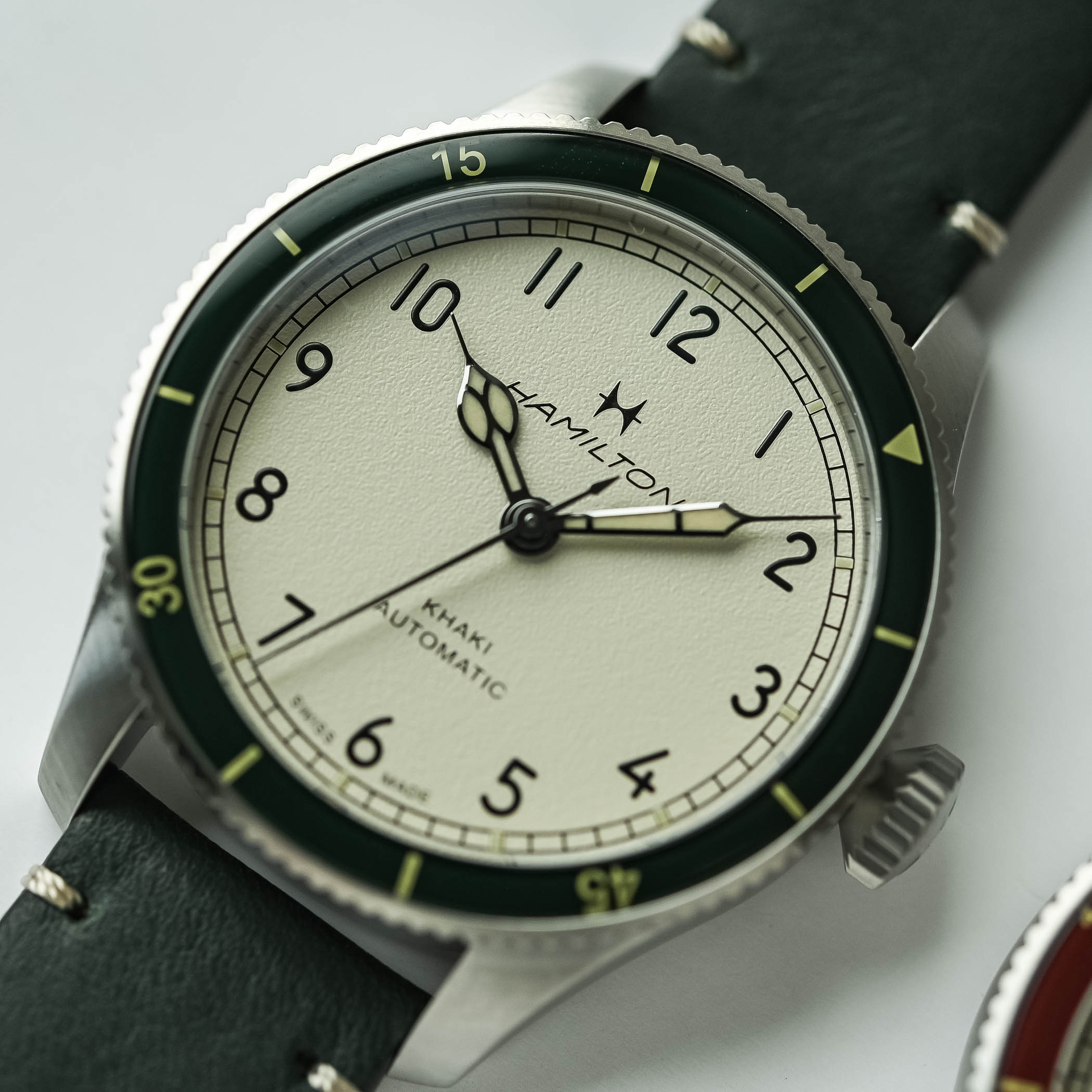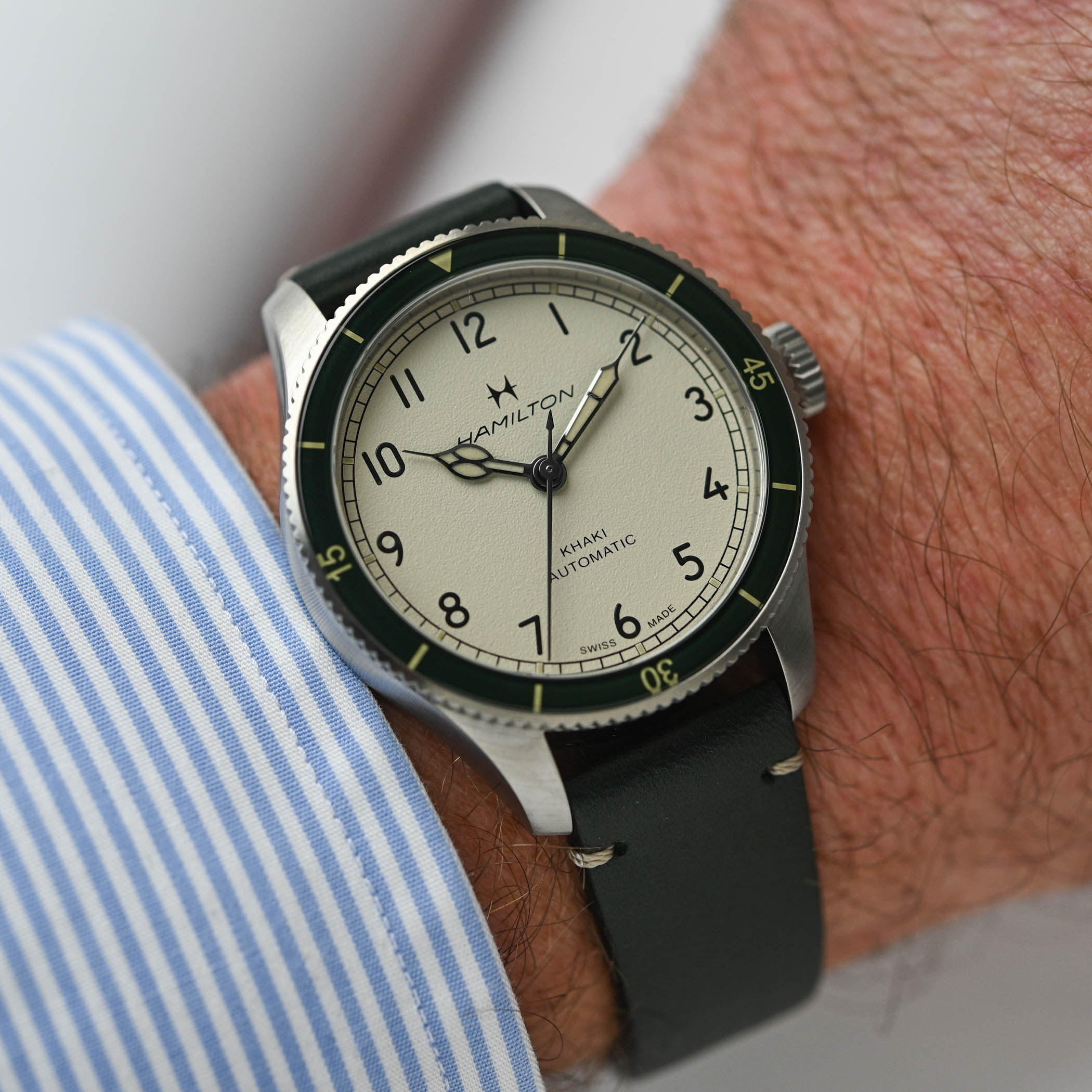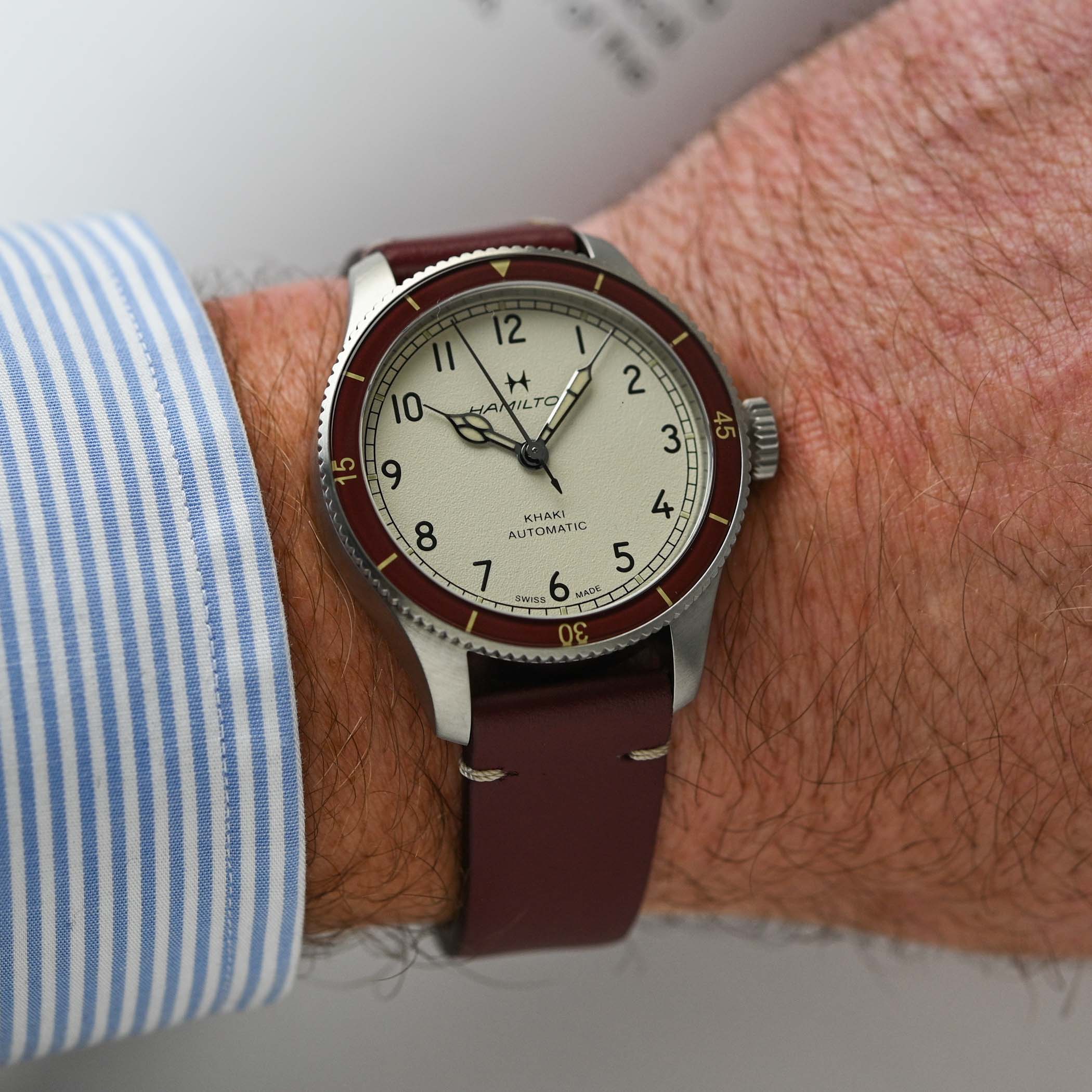 Quick Facts: 38mm diameter x 11.4mm height – brushed stainless steel case – 100m water-resistance – bi-directional bezel with mineral glass insert in burgundy or moss green – sapphire crystal with dual AR coatings – exhibition caseback – off-white grained dial with black Arabic numerals and railroad track with beige Super-LumiNova squares every five minutes – cathedral hands with beige Super-LumiNova inserts – calibre H-10 (Powermatic 80) – automatic – anti-magnetic Nivachron hairspring – 25 jewels, 21,600vph (3Hz) – 80h power reserve – 18mm leather strap in burgundy or green (to match bezel) with pin buckle – reference H76265810 (burgundy) and reference H76255810 (green) – CHF 950 or EUR 1,075