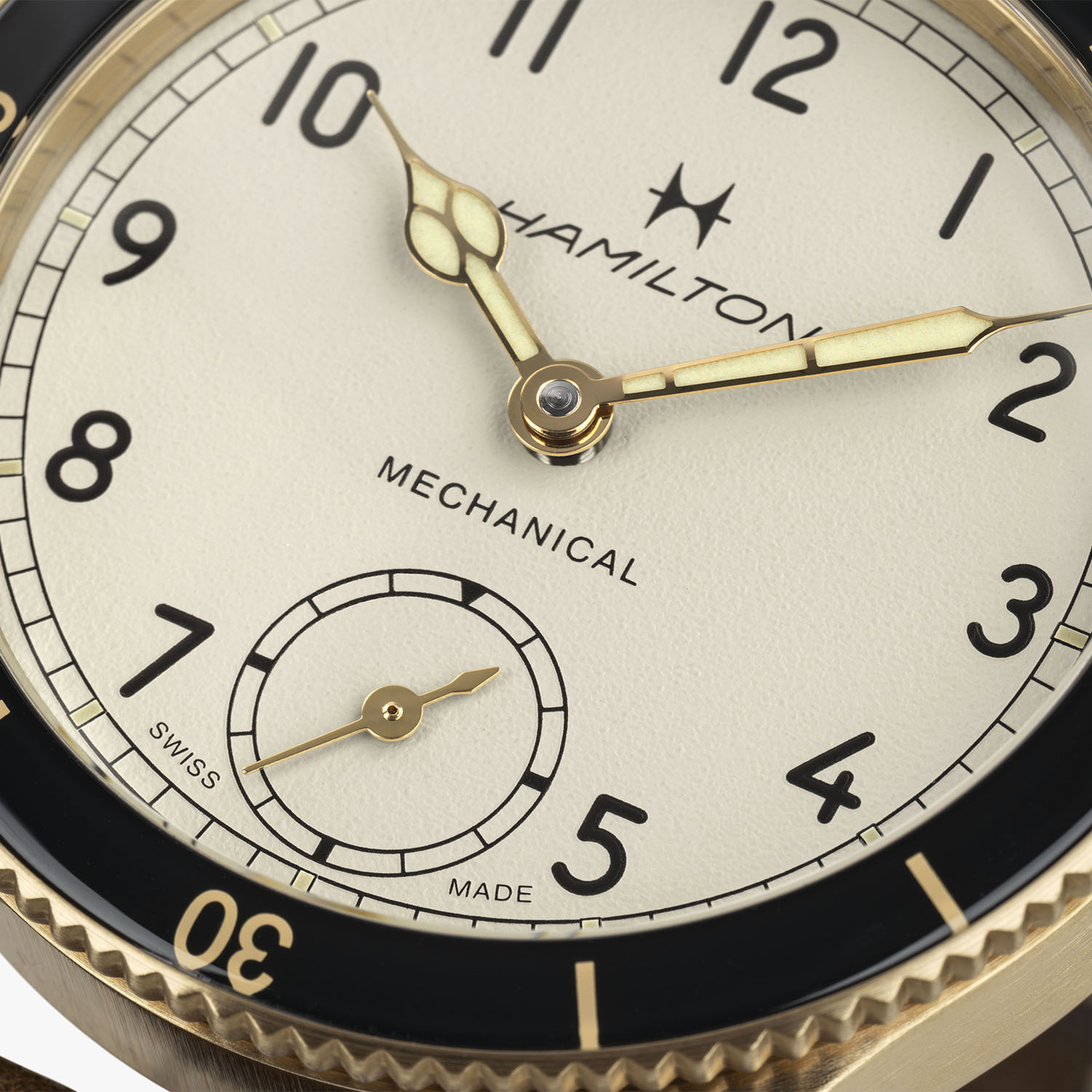 Quick Facts: 43mm diameter x 13mm height – brushed bronze – 100m water-resistance – bi-directional rotating bezel with black mineral glass insert and simple 60-minute scale – sapphire crystal with dual anti-reflective coatings – exhibition caseback – off-white grained dial with black Arabic numerals and railroad track with beige Super-LumiNova squares every five minutes – gold (galvanic plated) cathedral hands with beige Super-LumiNova inserts – small seconds sub-dial at 6 o’clock – ETA Unitas 6498-1 – hand-wound – 17 jewels – 18,800vph (2.5Hz) – 46h power reserve – 20mm brown leather strap with pin buckle – reference H76709510 – CHF 1,455 or EUR 1,645