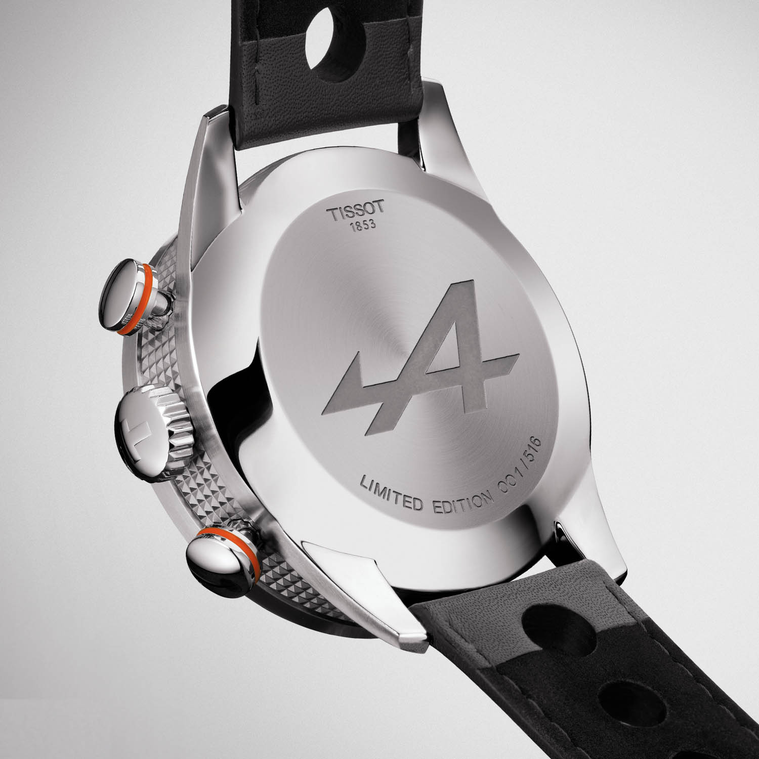 The case of this Tissot Alpine On Board is made of stainless steel and measures 45mm in diameter. It is polished and brushed, decorated with a racing-inspired pattern on the flanks and protected by a bevelled sapphire crystal on top (and a second sapphire crystal for the caseback). It is secured by a perforated black leather strap with orange stitchings. The same colour, inspired by the livery of the A110 S, is found on the dial’s markers, hands and date frame. The dial is grey-coloured and grained, an ode to the car’s livery. Finally, the sub-counters and the inner flange are black, the latter being equipped with a racing-oriented tachymeter scale.