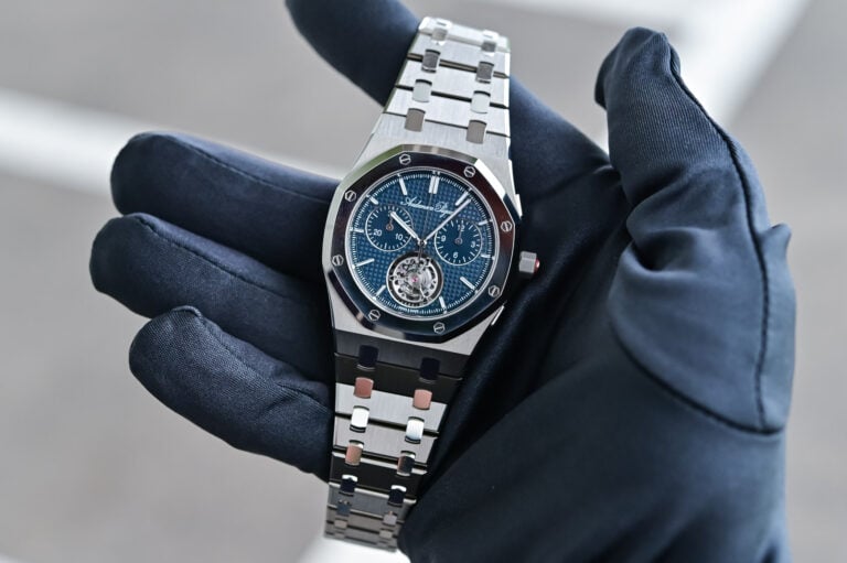 The beauty of an understated, uncluttered dial is its ability to weather the dictates of changing fashion and should, in theory, have a longer lifespan than a dial flaunting the latest trends. Sticking to the basics, the sunray dials – available in blue, black, golden, and silver – feature applied and faceted indices indicated by traditional dauphine-style hands, a rectangular date window with a white background at 3 o’clock, and a peripheral minutes/seconds track. The deliberate absence of luminescence lends the watch a more dressy personality.