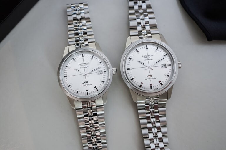 Although we photographed the steel model with a sunray blue dial, the lineup of seven watches comes in steel cases, yellow or rose gold PVD cases, or two-tone steel and gold PVD cases. Versatility is enhanced by a choice of a slightly sportier and practical 5-row metal bracelet or a classic leather strap with a pin buckle, both of which are interchangeable thanks to the quick-release spring bars.