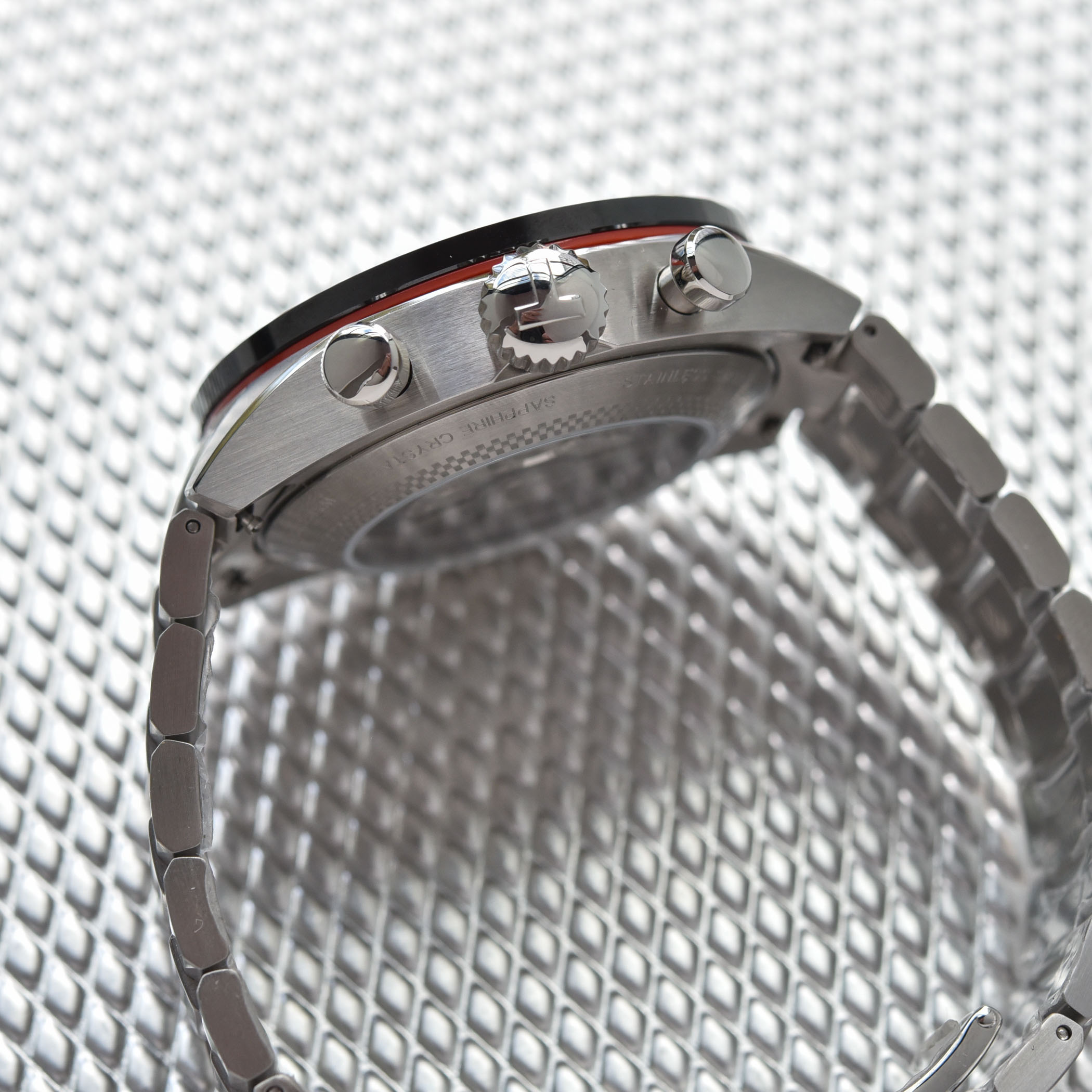 Considering the price range at which this watch is offered, the execution is pretty pleasant. The case, mostly brushed, has nice polished bevels on the sides of the lugs. Also, it is topped by a ceramic bezel, with brushed surfaces on top, and a tachymeter scale engraved, later filled with white lacquer. The oversized pushers have been redesigned too, and are now cleaner. All in all, this results in a more modern, sleeker look, yet still with an imposing presence. Also, the watch carries pleasant water resistance, as rated at 100m.