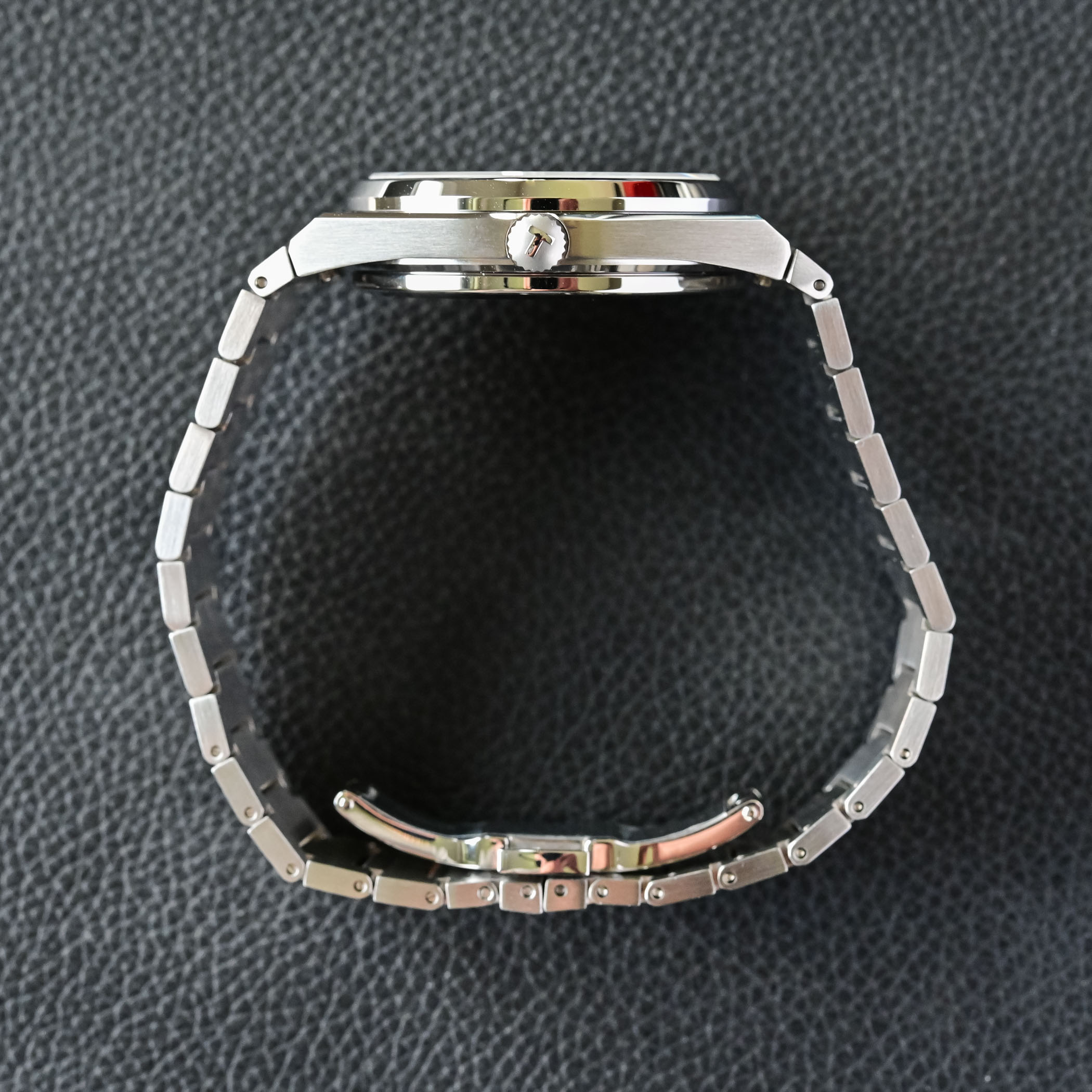 We can’t talk about such watches without paying attention to the bracelet. Of course, Tissot for its PRX has opted for a classic “integrated” style where the lines of the case extend directly into the bracelet without recourse to the traditional lugs. Finished in the same way as the case, with brushed surfaces and polished accents, it relies on large links. Again, comfort is great with a thin profile and good flexibility. The bracelet makes for an ergonomic feel on the wrist and a soft contact with the skin. The bracelet is closed by a concealed triple folding clasp. The two elements that remind of the entry-level positioning are the absence of fine adjustment and pins to size the bracelet – but this is forgiven knowing the price…