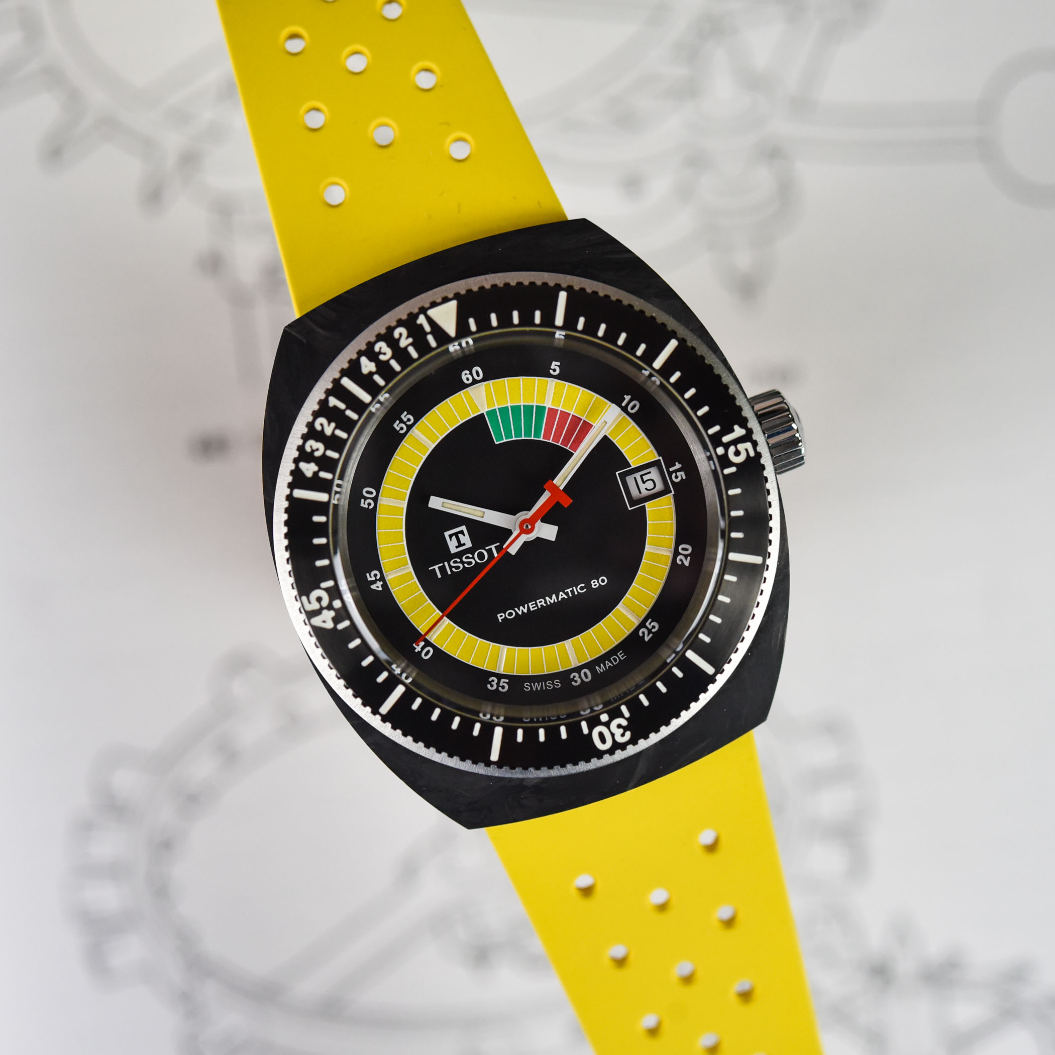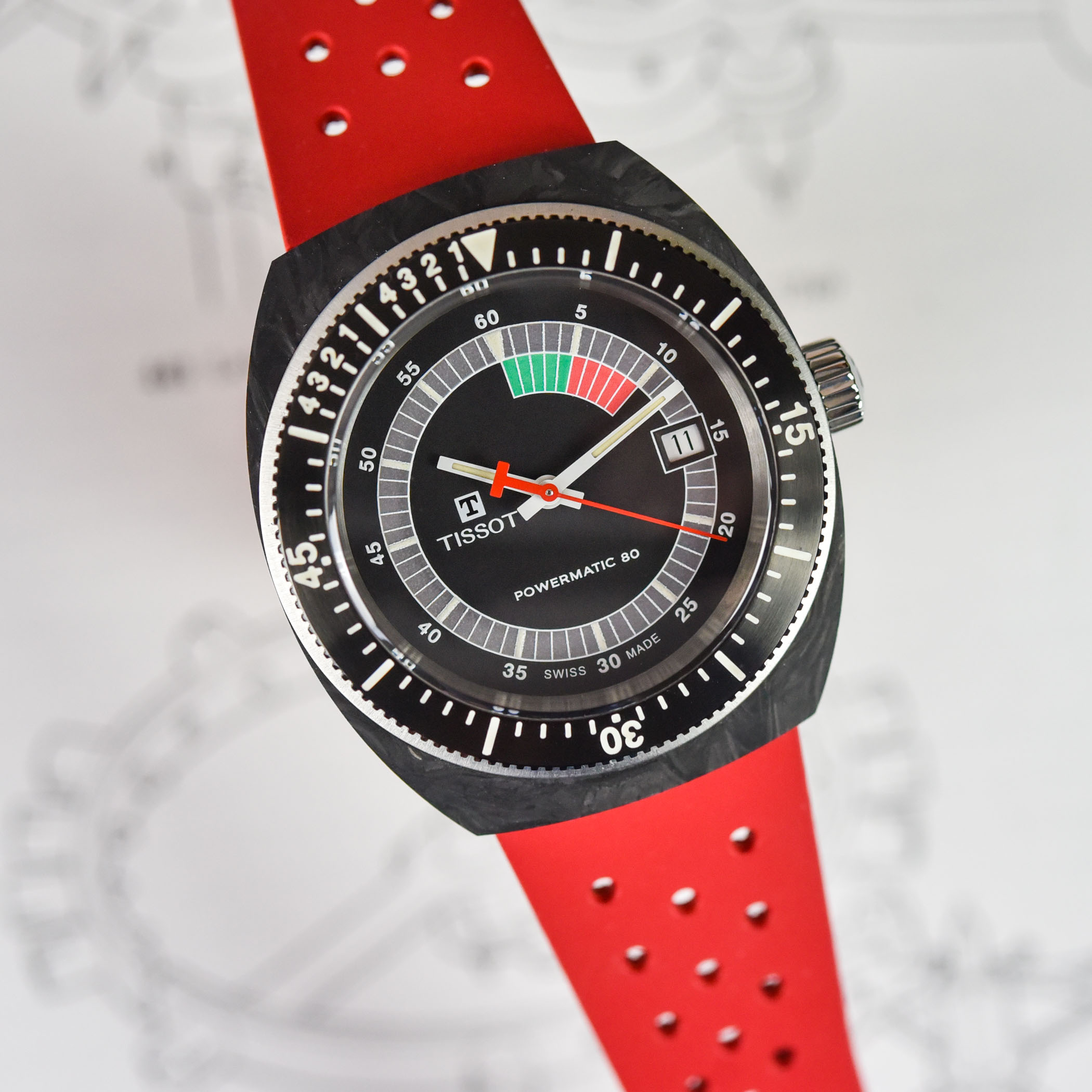 The popularity of vintage- or retro-inspired watches is evident, as we see new releases based on old designs pop up almost every week. Most of these date back to original creations from the 1960s and 1970s, perhaps the ‘Golden Age’ of watch design. This is the era that brought us watches like the Royal Oak and the Nautilus (and the PRX!), handsome chronographs like the TAG Heuer Carrera and Monaco but also a literal smörgåsbord of cool and capable dive watches. This was also the period Tissot had some fun with incorporating newly conceived materials in watchmaking, such as fibreglass! At the time, this was a groundbreaking and still quite novel material, which found its way into the Tissot Sideral. Now, decades later, the Sideral makes a return not with fibreglass but forged carbon fibre instead!