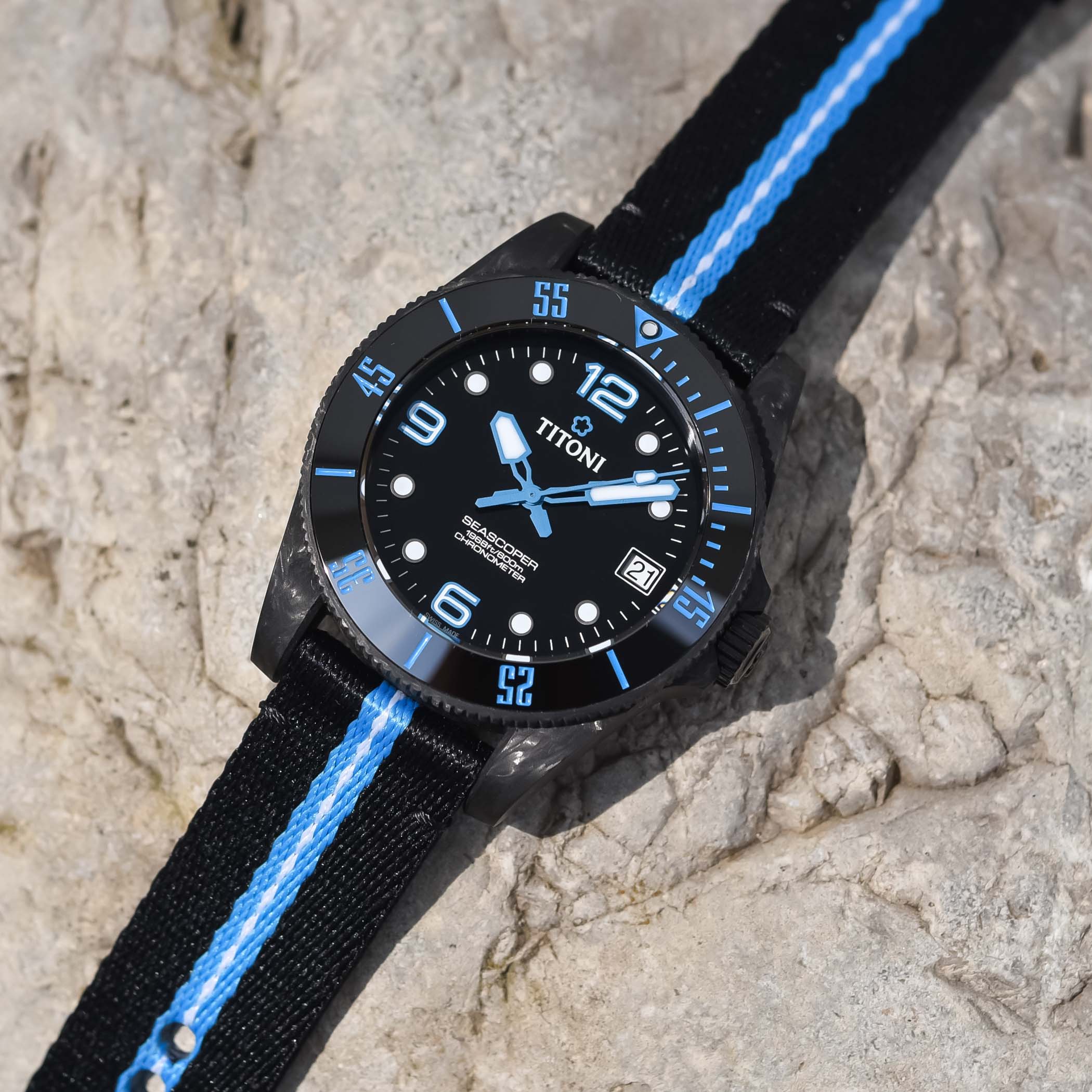 The Titoni Seascoper 600 CarboTech is worn on a black rubber strap closed by a black-coated folding clasp. Additionally, the watch is delivered with a #tide strap made from recycled ocean plastic. Released as part of the permanent collection, these new carbon dive watches are priced at EUR 2,910 (incl. VAT and shipping) for the blue or black models and EUR 3,000 (incl. VAT and shipping) for the rainbow version – which, once again, is a fair price for what you’ll get in return. For more details and orders, please visit www.titoni.ch.