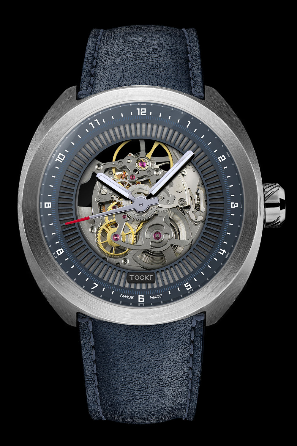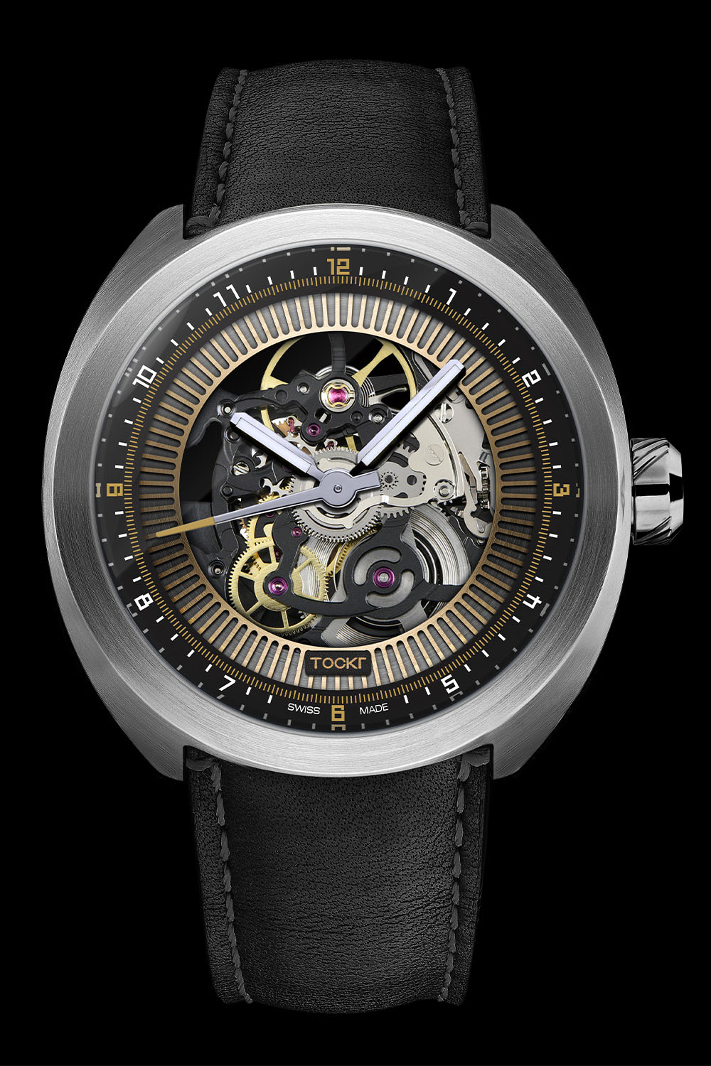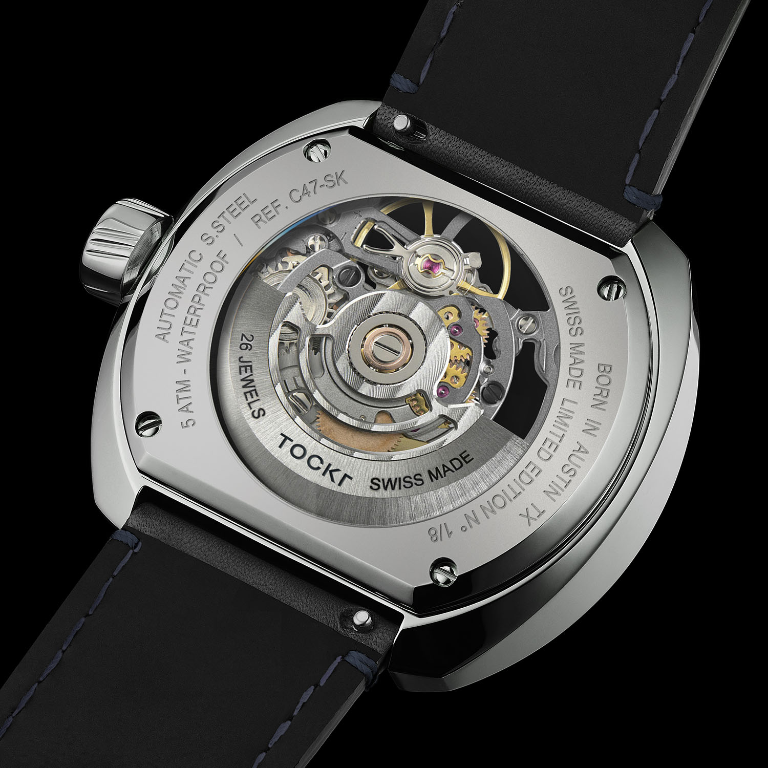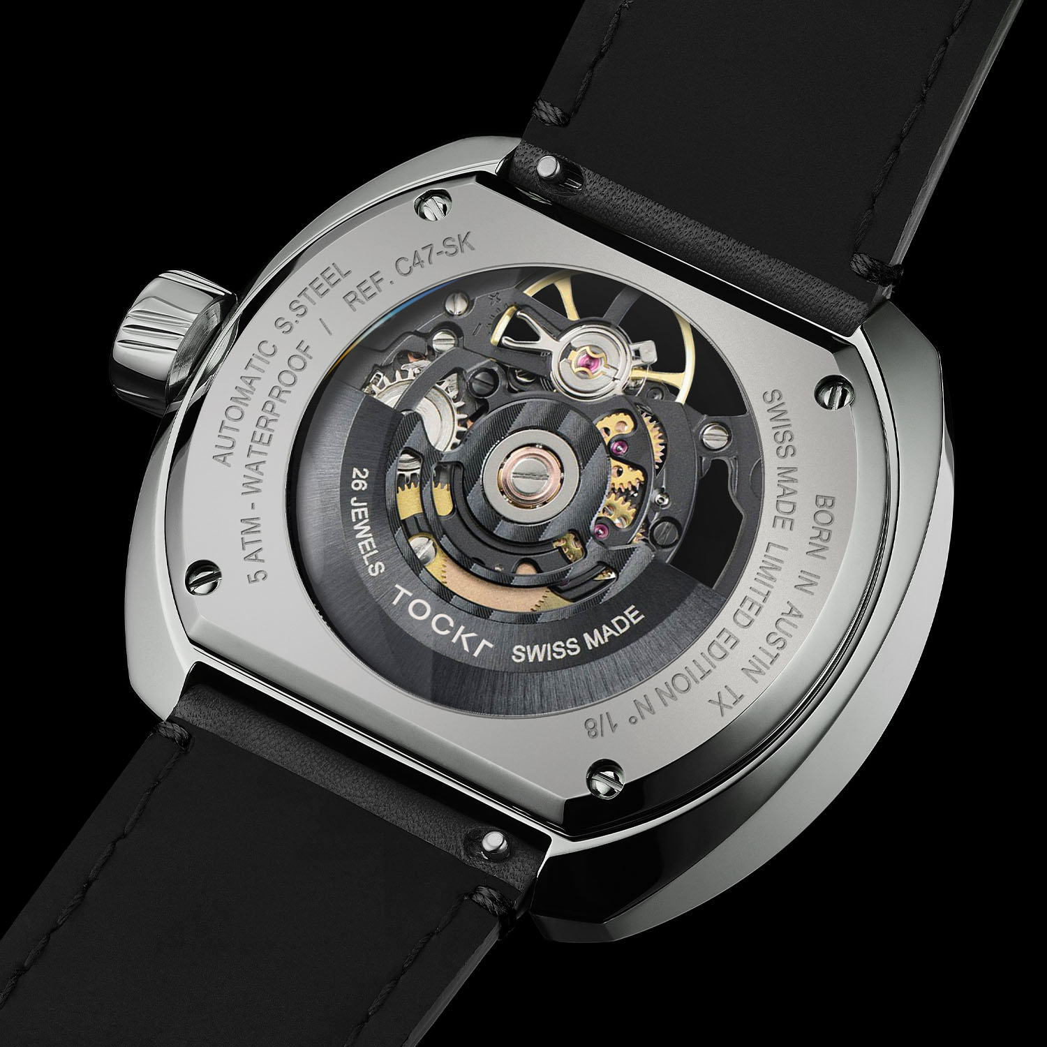 Skeletonized watches are nothing new, of course, but Tockr has maintained its signature aviation look while tastefully flaunting a Swiss automatic on both sides. The cushion-shaped case is 316L stainless steel and a reasonable 42mm in diameter. The angled knurling on the crown gives it an almost turbine appearance and water-resistance is rated at 50 metres. A machining of the case slopes inward to the front crystal and acts as the bezel, and both the front and rear crystals are sapphire with anti-reflective coatings. The caseback is secured with four screws and each edition is numbered from 1 to 8. The strap is hand-stitched calf leather with a second silicone band, and both have steel, signed pin buckles and quick release levers.