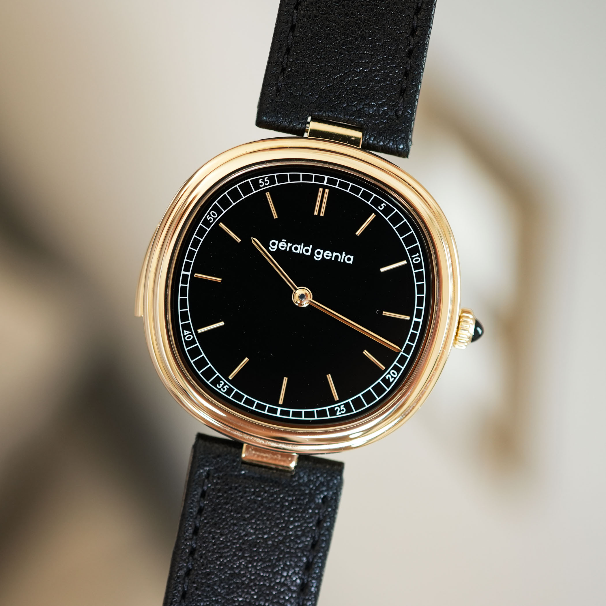 Picture this: a yellow gold case with a subtle cushion shape, a black onyx dial with only the bare essentials and a rather slim minute repeater. Now add to that the Gérald Genta name, and you get this, the wonderfully elegant Gérald Genta Minute Repeater. The shapes, the mechanics, the minimalism … It’s all incredibly coherent and oh-so-lovely. One detail that really stands out is the design of the minute track, which follows the shape of the case. It’s a superb touch to a superb watch.