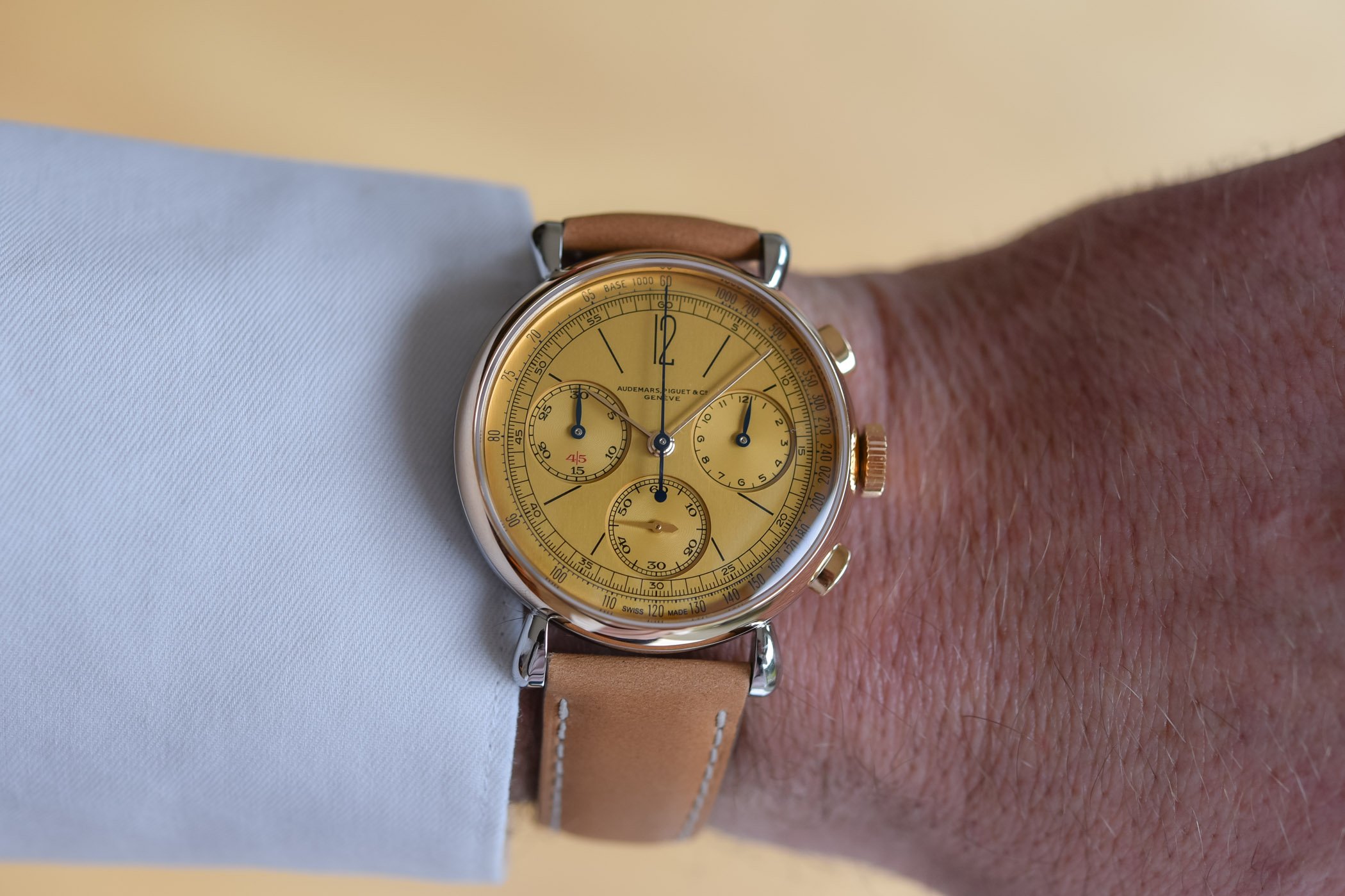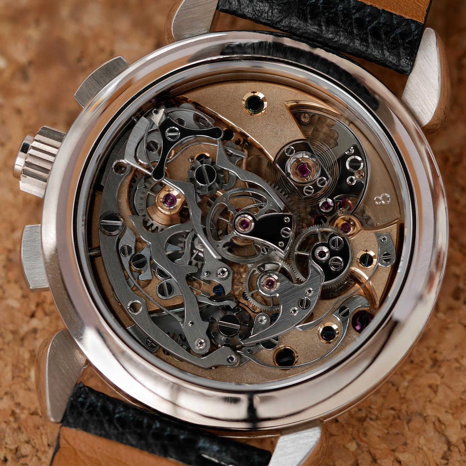 Quick Facts: 39.8mm diameter – 18k grey gold case – Venus 185 ébauche, restored, new parts crafted, decorated by hand – hand-wound split-seconds chronograph with two column wheels, horizontal clutch – 36h power reserve – unique piece made only on request – from EUR 85,000 depending on options
