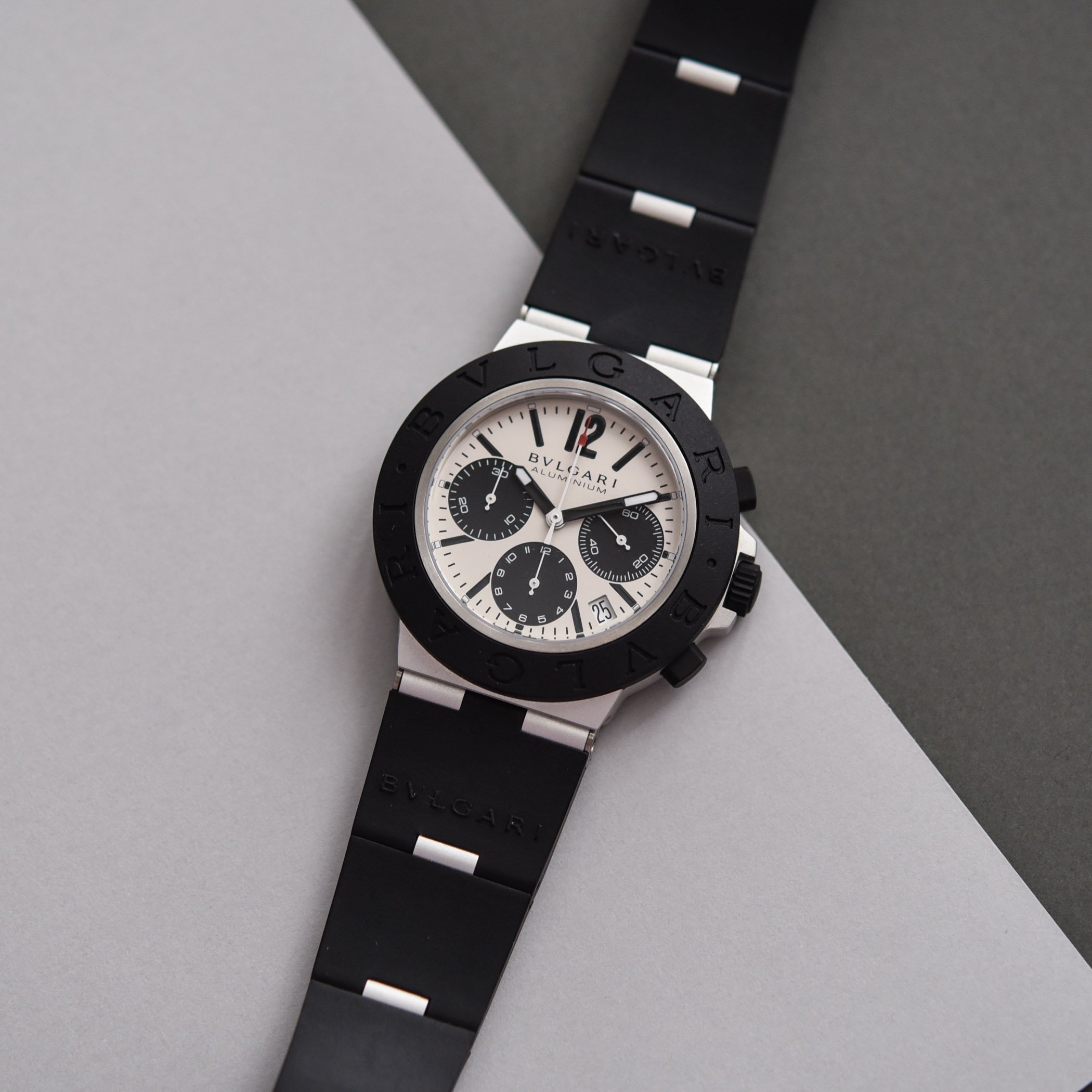 Following the success of its Octo collection, this year Bvlgari revisits one of its emblematic models from the 1990s, the Aluminium watch, a provocative take on the sports watch with contemporary materials and winning Italian design. Created as an accessible and “fun” take on watchmaking, modelled after the Diagono collection, the 2020 Bvlgari Aluminium collection is a very cool design statement and available in this nice automatic chronograph version. Slightly modernised for the occasion, the case is made from matte aluminium and black rubber and worn on a bracelet made from the same combination of materials. A watch with great appeal and character, imposing design and a playful spirit.