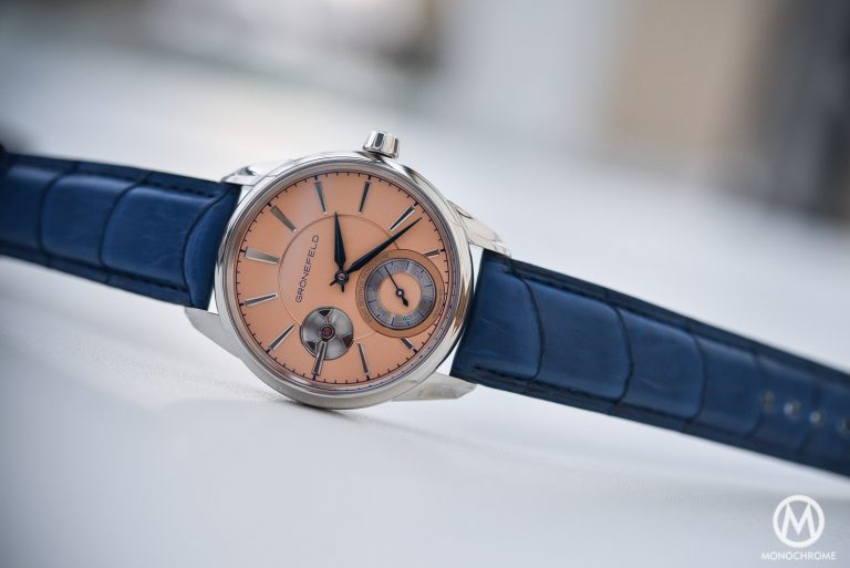 The main complication, a remontoire, is not unique however to me it is one of the most attractive complications in the entire horological field, because it’s focused to achieve a constant force. The Grönefelds included a governor to balance out the forces in the gear train, making the watch (theoretically) even more precise. Again one of those stunning ‘extra’s’ that make a watch guy’s heart beat faster. Especially because they choose to show the governor on the dial side, reminding of the 8 seconds that the remontoire spring is being charged, and subsequently releases its energy.