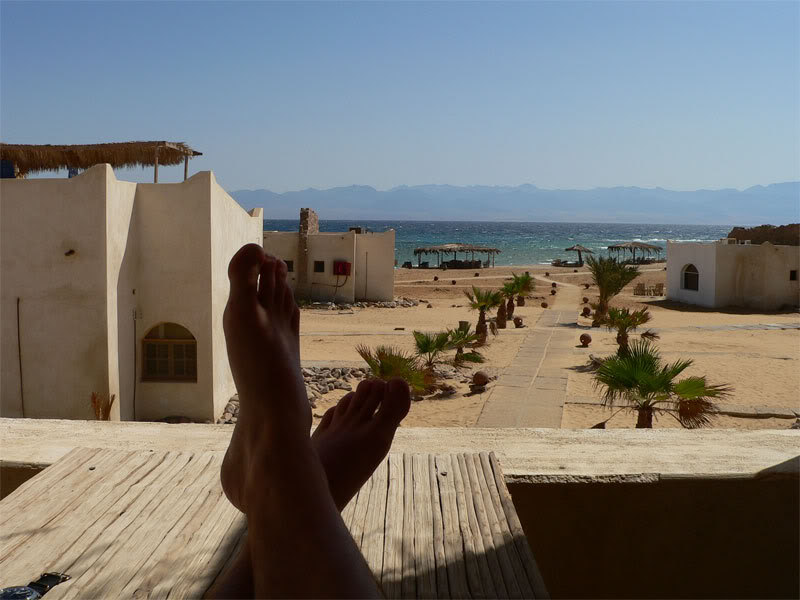 After we had enough of 35+ degrees Celcius, warm dry air in your lungs all the time, and looking at sand, rock and more sand, we decided it was time to take a plunge in the Red Sea. So we drive to the Jordan town of Aqaba, to find that all decent hotels were fully booked! Time for plan B, and that meant we took the fast ferry to Nuweiba, a small village in the Egyptian Sinai desert. There’s not much going on in Nuweiba, at least on land. The thing we really came for was below sea level, as there are some brilliant dive spots in the area.