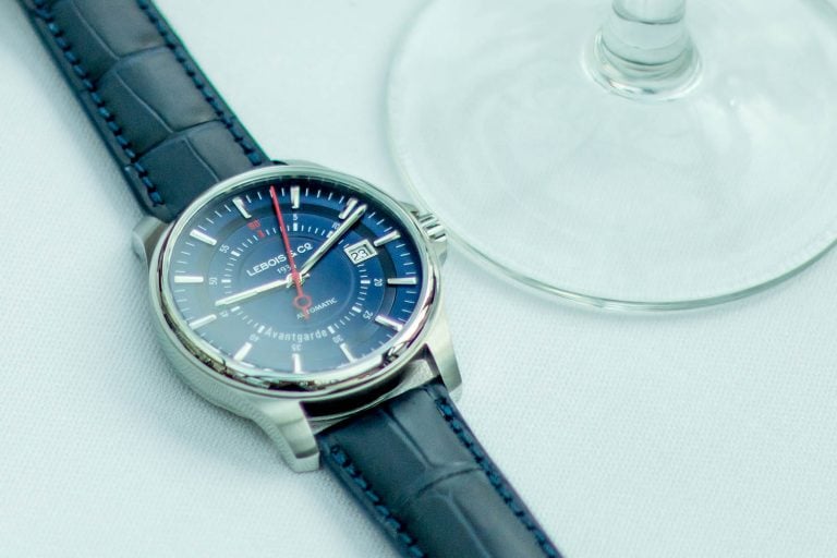 Keeping everything fastened to your wrist is your choice of brown or black perforated Nappa leather strap with contrasting red stitching. The stitching ties the strap into the accents on the dial. The signed, brushed stainless steel buckle mimics the finish of the case.