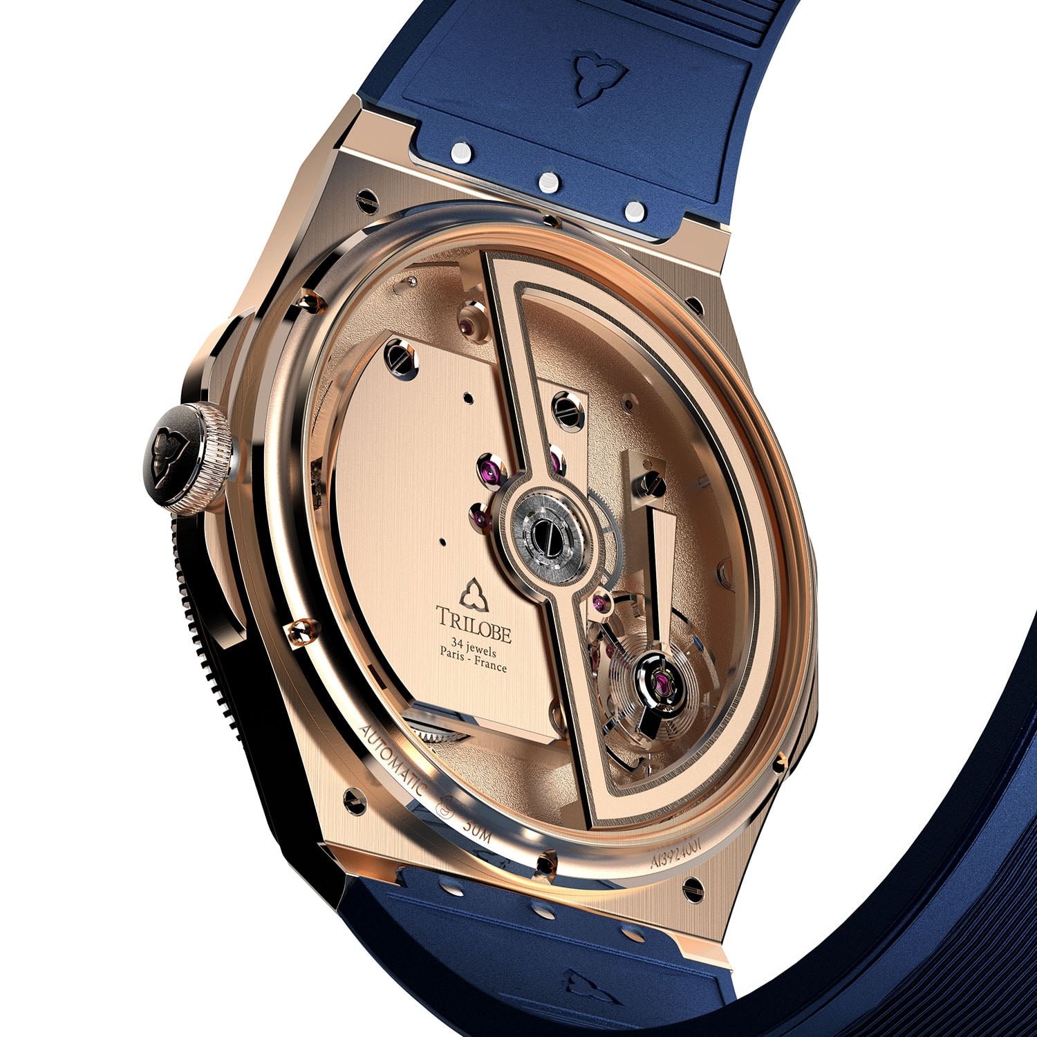 The Trente-Deux case retains its measurements, 39.5mm in diameter and 10.15mm in height, and it is constructed from seven elements with a mix of satin-brushed, microblasted and polished finishes. The fluted bezel features polished ridges and recessed grooves. The integrated design ensures continuity between the case and bracelet or strap. Alongside the stainless steel version, Trilobe now introduces an 18k rose gold edition with a dark blue rubber strap. Water-resistance remains rated at 50m.