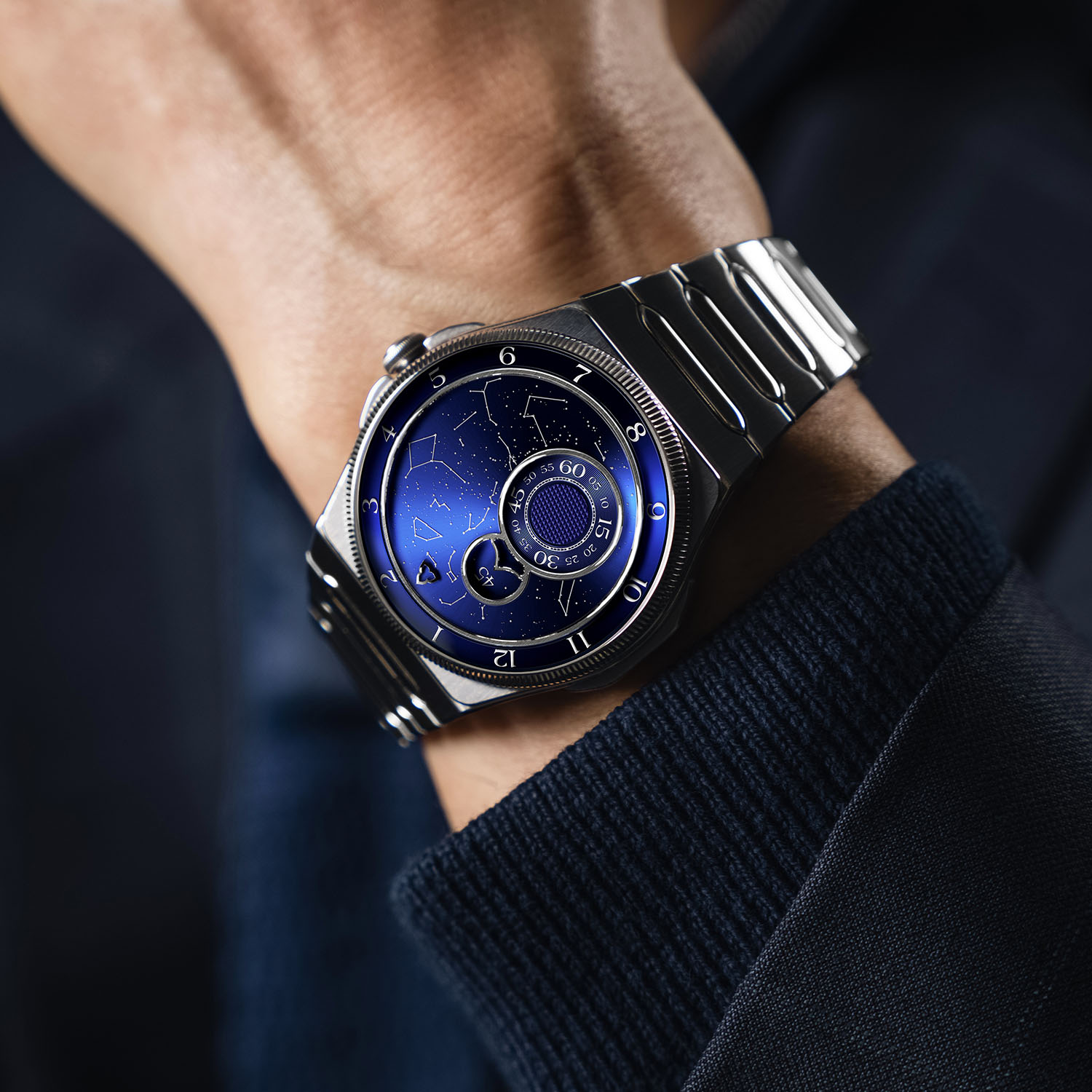 Building on the brand’s constellation motif, the dial for each piece is now configured according to a specific date, time and location chosen by the client. Using astronomical calculations based on the work of Belgian meteorologist and astronomer Jean Meeus, the exact positions of the stars are reproduced, resulting in a unique star map for every watch. The constellations are pad-printed in successive layers of metallic pigment, creating subtle relief and depth against a lacquered background, with the stars appearing suspended above the dial.
