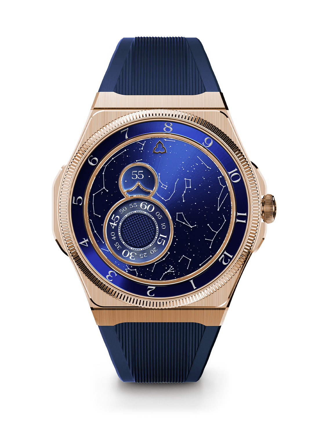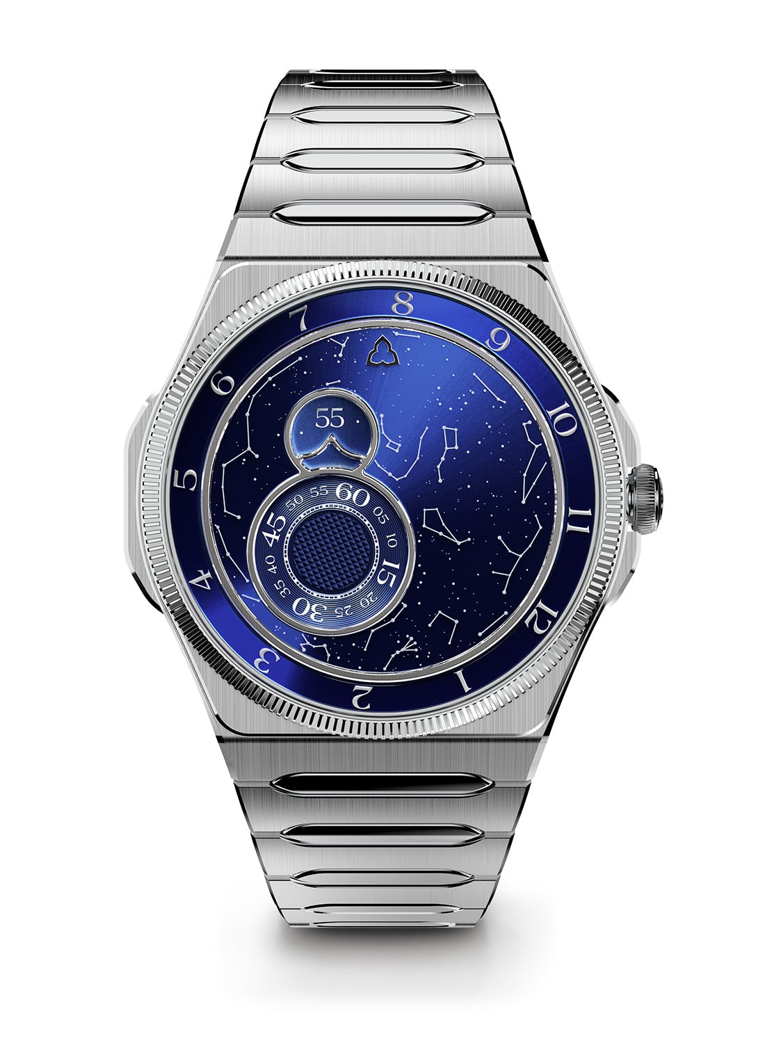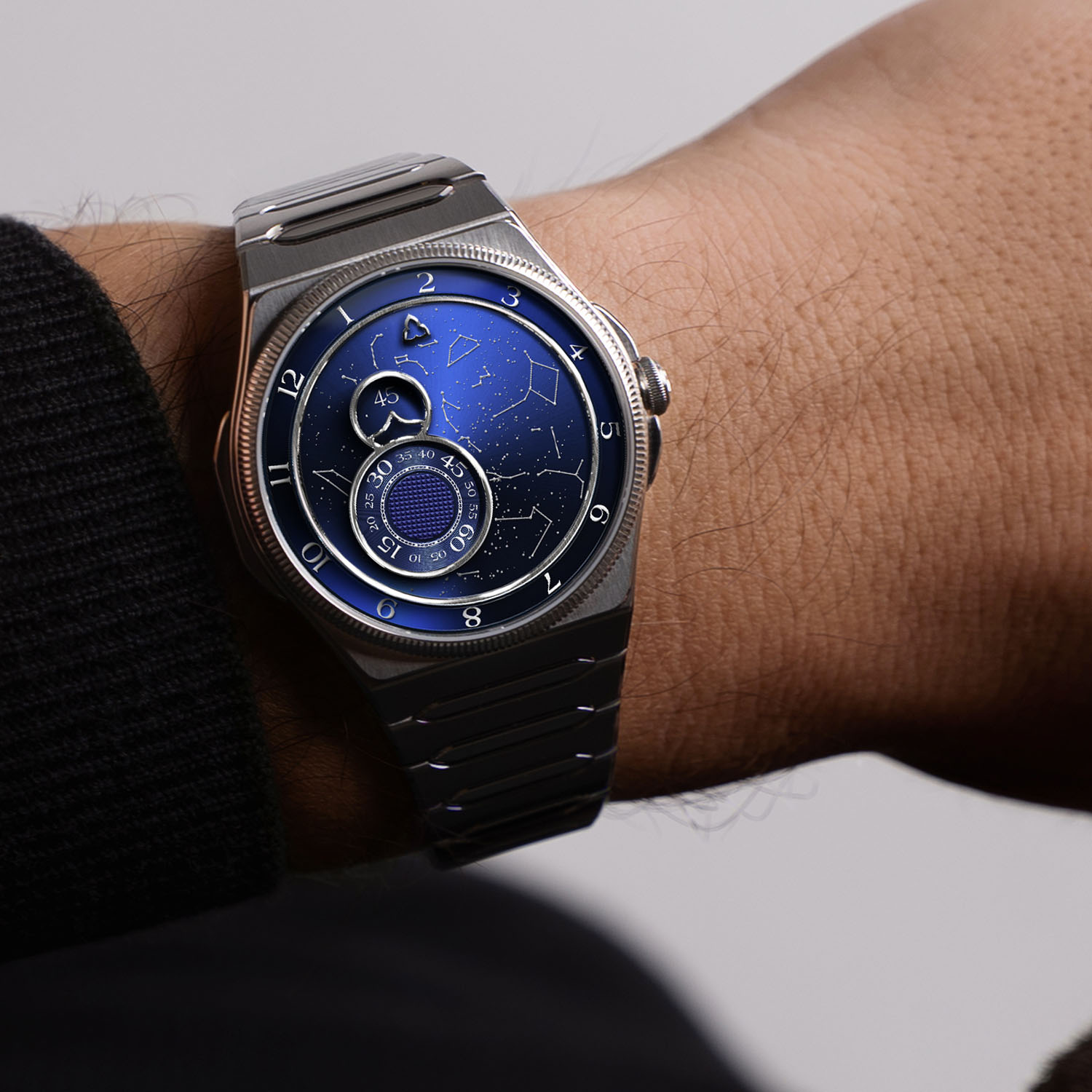 This star map is combined with Trilobe’s signature display. Hours, minutes, and seconds are indicated by rotating rings via three fixed pointers. Finishing includes sunray-brushed surfaces and a seconds wheel combining azuré and Clou de Paris guilloché. The circular flange boasts a satin- and mirror-polished finish.