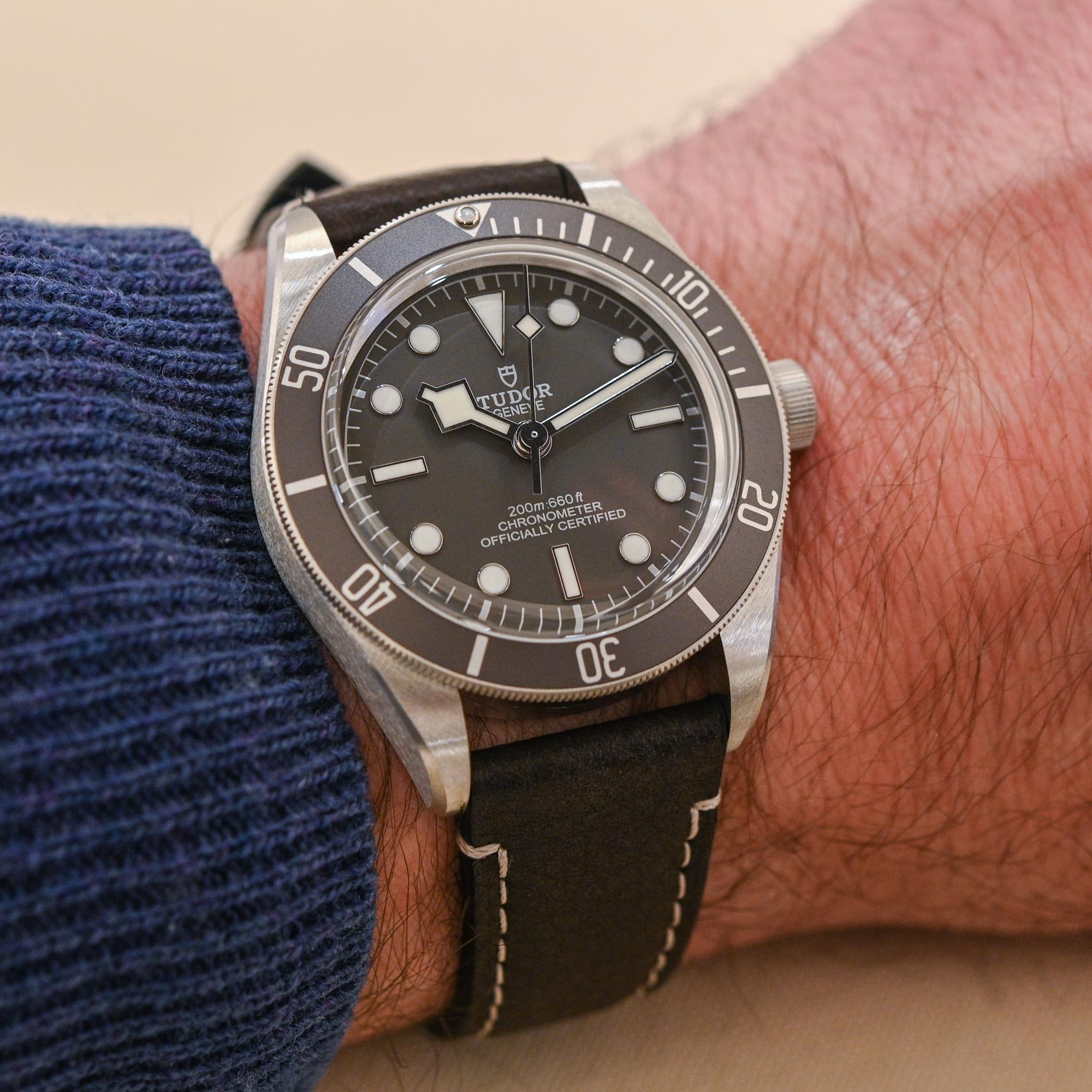 The Tudor Black Bay 58 we experienced was fitted with a 3-link “rivet-style” stainless steel bracelet with the sharp Tudor shield on the flip-lock, mostly satin finished. Other options include a 5-link bracelet or rubber strap, all of which come with a TUDOR “T-fit” clasp, which allows for micro-adjustment and hassle-free fit.
