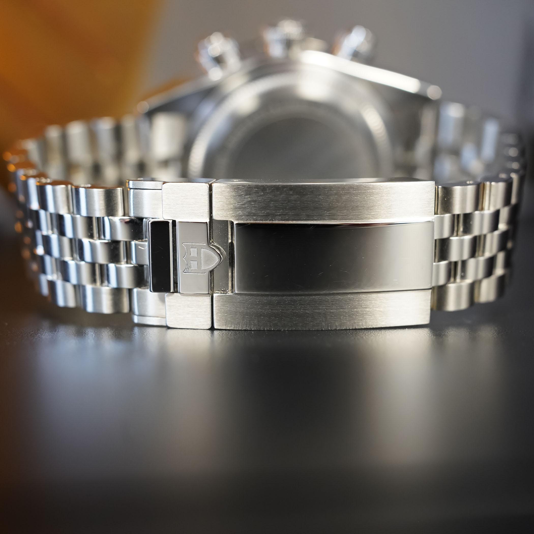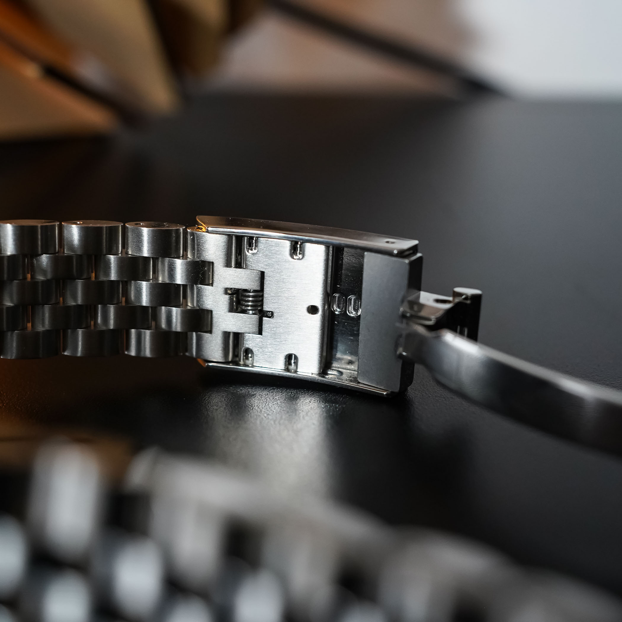 The final specificity of this Blue chrono is the bracelet. Contrary to the panda models, but like the Pink edition or the recently revised versions of the Black Bay, it is worn on a 5-link Jubilee-style bracelet – no other option available, no additional strap included. This Jubilee bracelet, in my opinion, benefits both the looks and the comfort. It adds a cool retro touch to the watch, and mostly, it is far more flexible and soft than the Oyster bracelet. And it comes with the T-Fit micro-adjustment folding clasp, allowing for an instant adjustment of the total length of the bracelet along a window of 8mm on 5 steps.