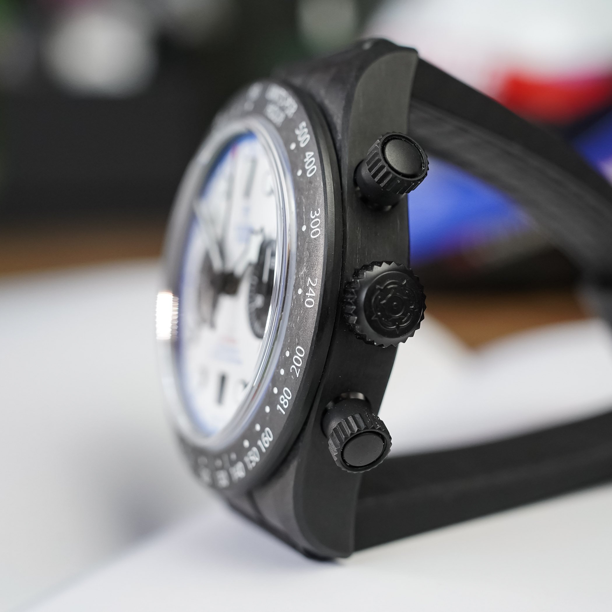 So what changed my mind with this one? Well, that’s a bit tougher to explain, but it comes down to a few things. First and foremost, the combination of black and white, mixed in with a touch of blue, simply works for me. The strong contrast between the colours is just cool, and it keeps the legibility and functionality of the Black Bay Chronograph right where they need to be. Then there’s the weight, or lack thereof, actually. Being made almost entirely of carbon fibre, it weighs next to nothing, for a chronograph at least. It’s a sizeable watch at 42mm across (1mm larger than a steel version) and 14.3mm in height, but it’s very wearable! For all the details and specs on this watch, I suggest checking out the initial write-up here.