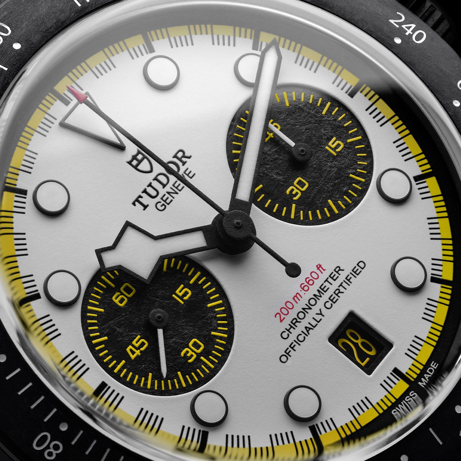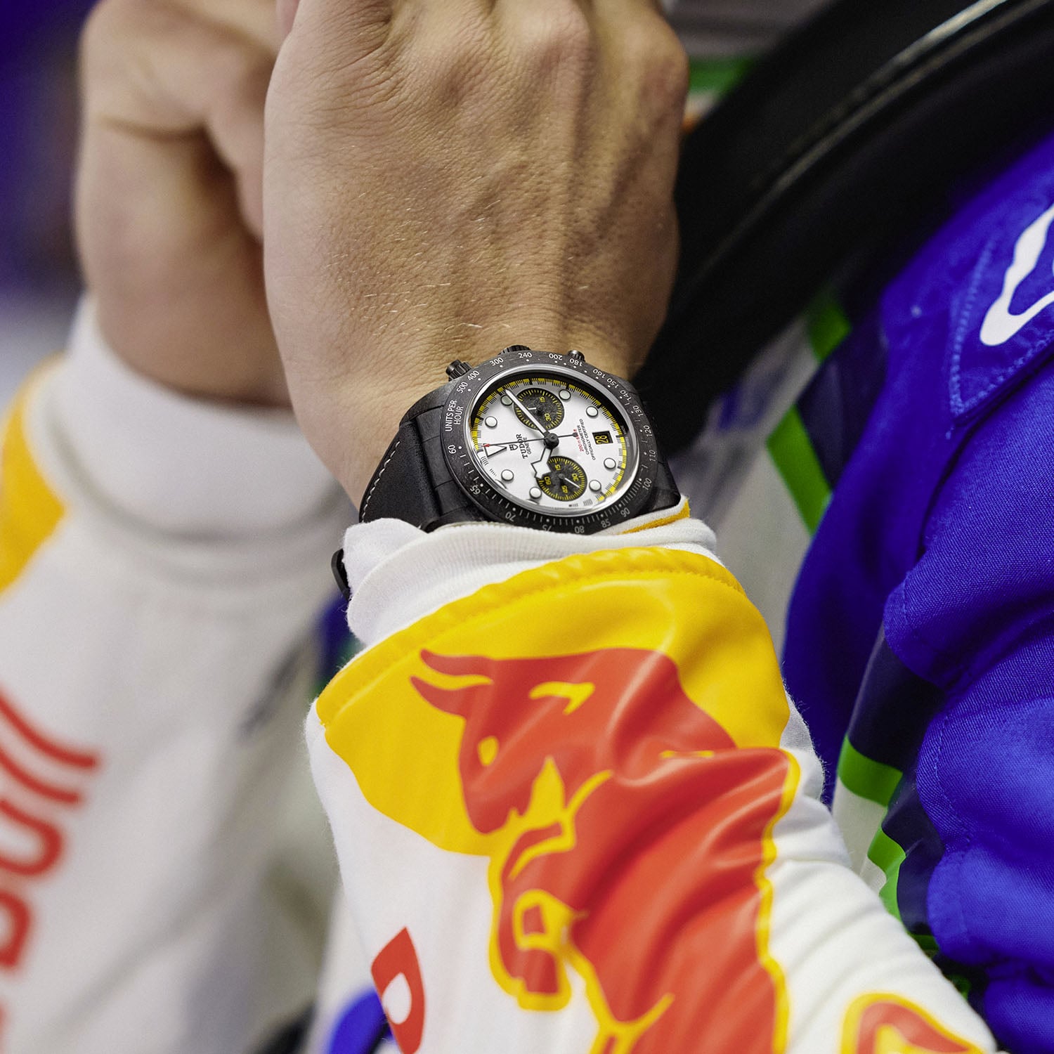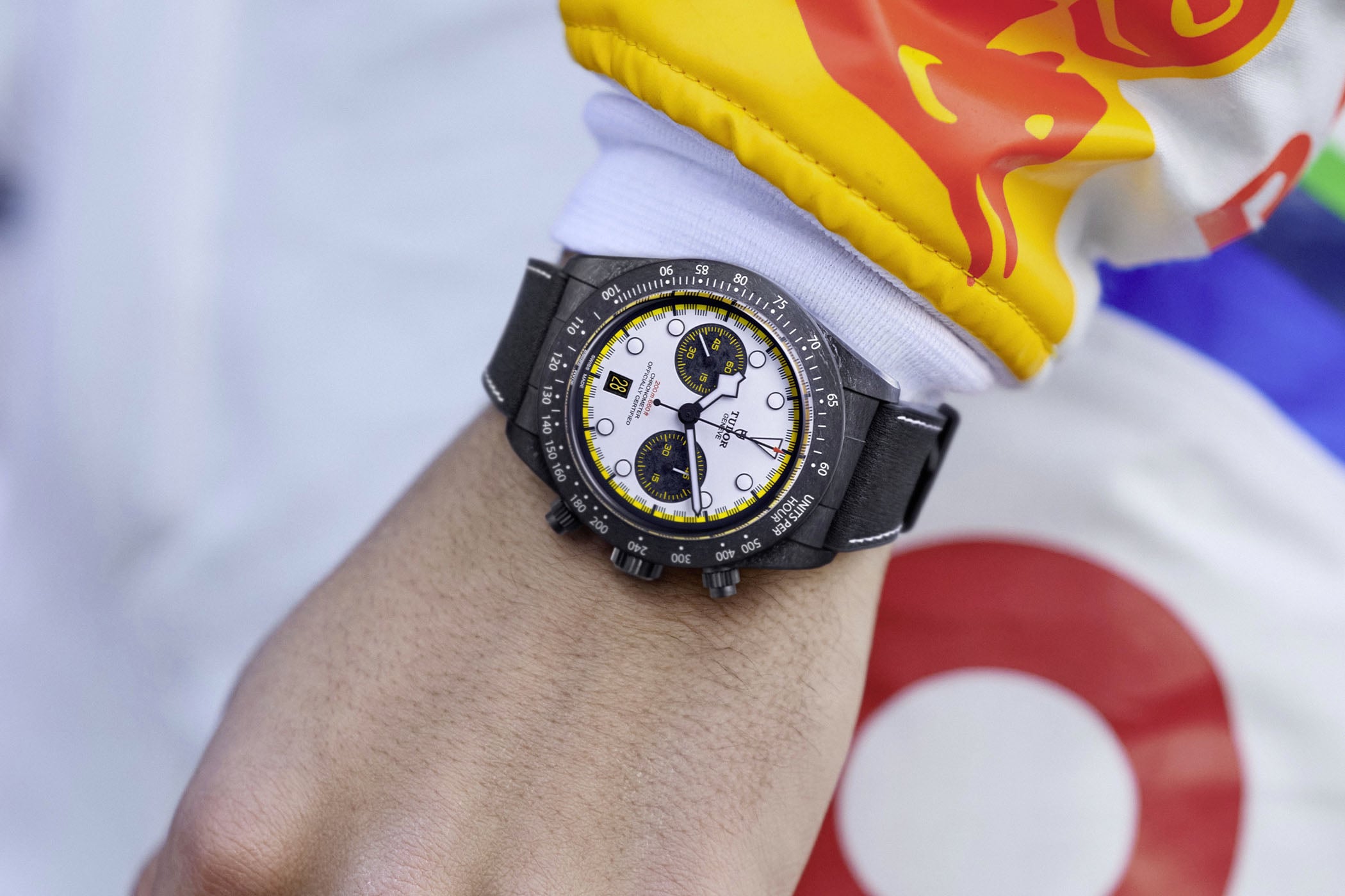 The main novelty for this Black Bay Chrono Carbon 26 concerns the dial, which is modelled after the 2026 Visa Cash App Racing Bulls team car, dubbed VCARB 03. What remains is the racing white base paired with carbon fibre sub-dials. Even the date window is framed in carbon. The dial is a layered dial construction, alternating brass discs and carbon fibre sheets. The bright blue accents of last year have, however, been replaced by yellow accents on the minute track, the sub-dials and the date disc. The handset and applied markers are classic Tudor and outlined in black for contrast.