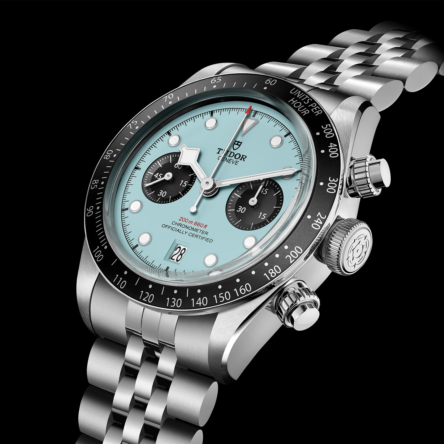Just like the Pink and Blue editions, the Black Bay Chrono Flamingo Blue comes on a 5-link jubilee steel bracelet – adding a slightly retro touch that works well with this turquoise dial – which is closed by a folding clasp with T-Fit micro-adjustment.